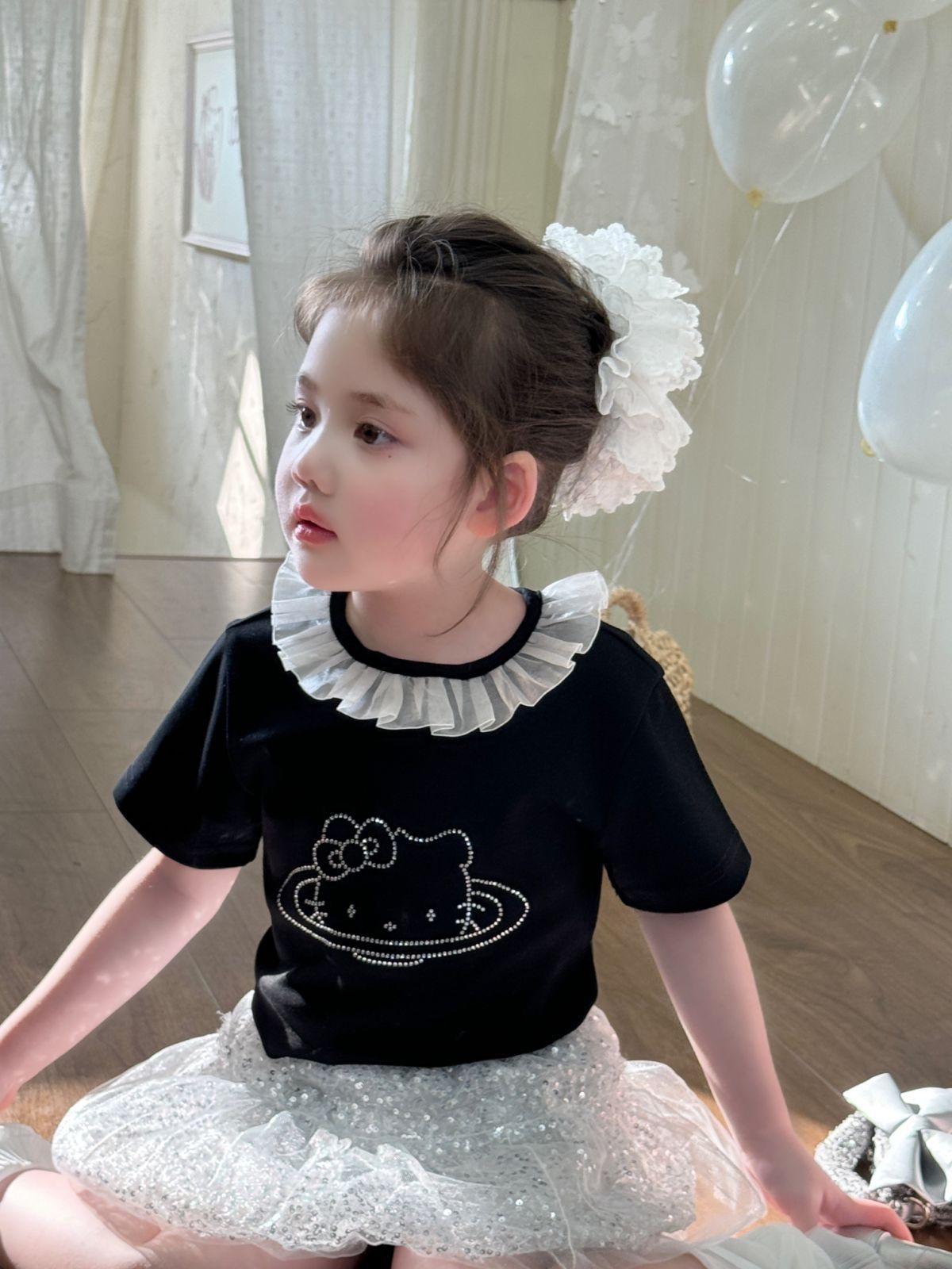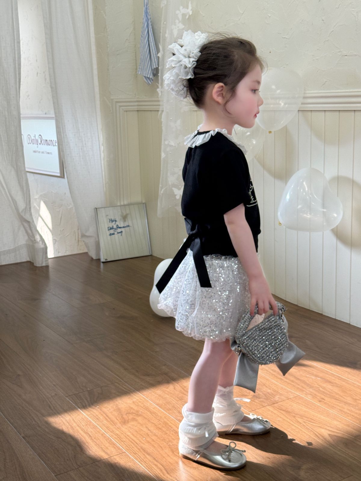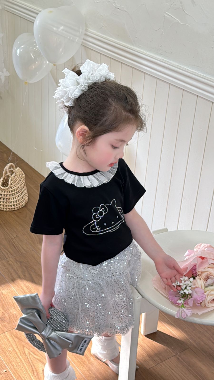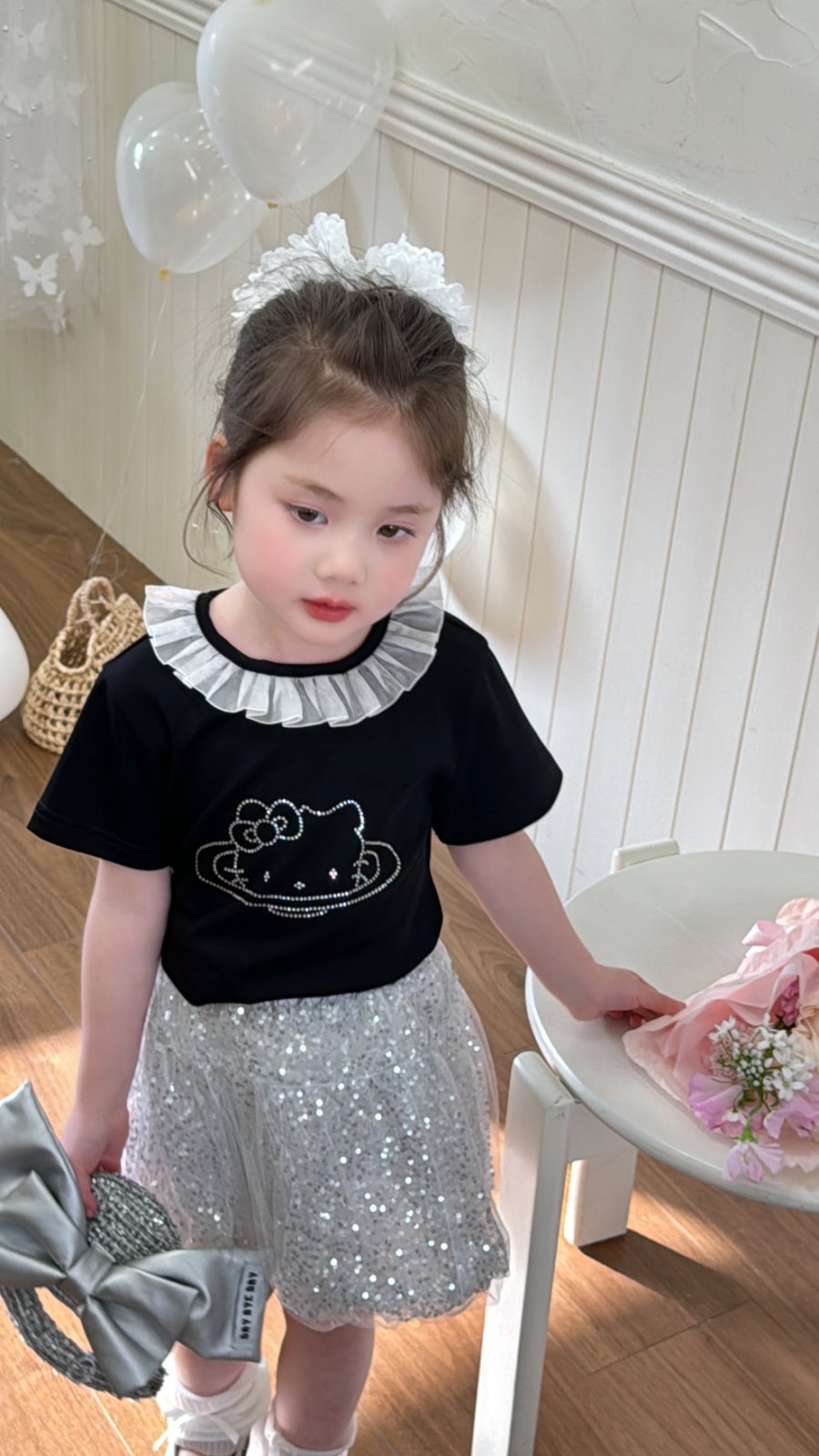 사이즈 롤 25 여름 새로운 소녀 짧은 소매 티셔츠 레이스 칼라 만화 핫 다이아몬드 달콤한 귀여운 탑 스팽글 스커트스토어 가기