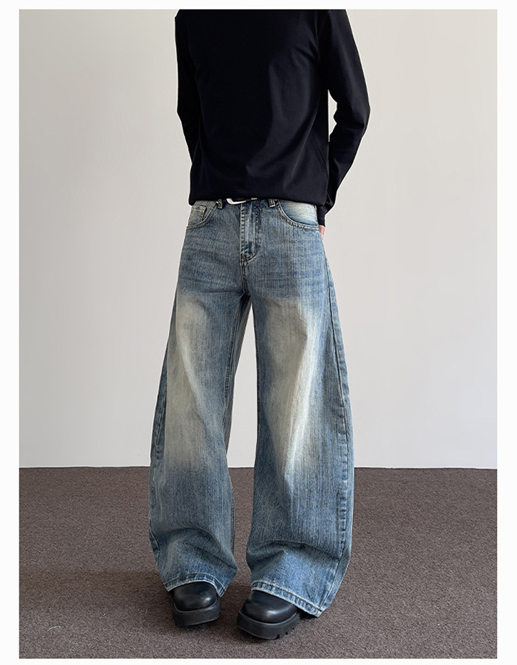 하이 스트리트 대나무 패턴 씻은 Machete 청바지 남성과 여성의 미국 스타일 루즈 레트로 고급 스트레이트 다리 긴 바지스토어 가기
