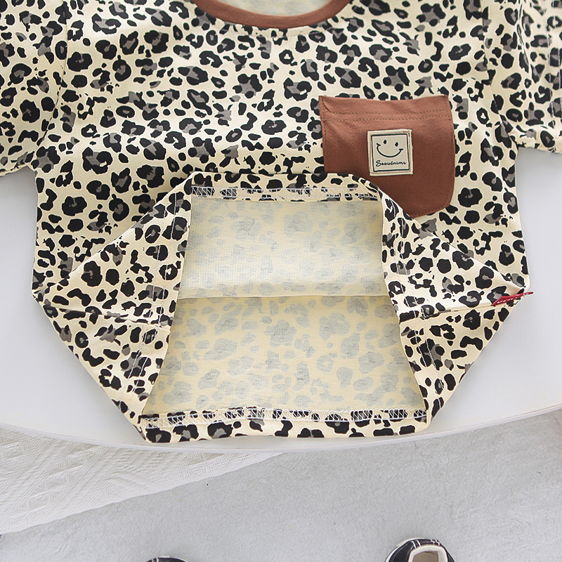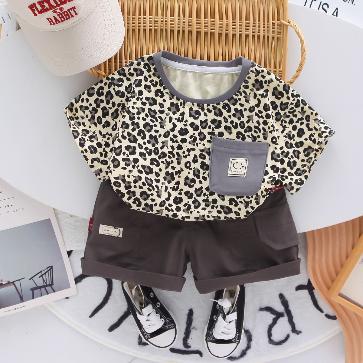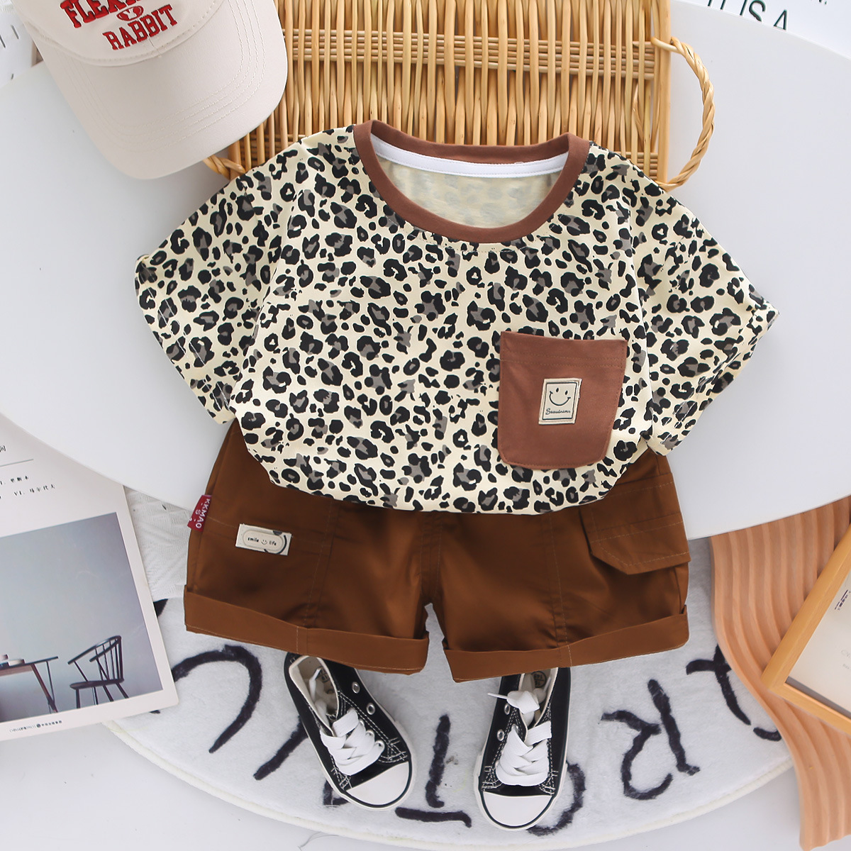 어린이 티셔츠 여름 어린이 레오파드 프린트 반팔 탑 어린이 라운드 넥 캐주얼 루즈 반소매 반바지 투피스 세트