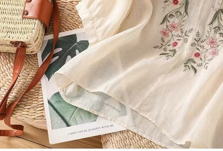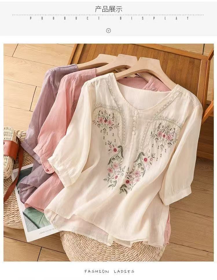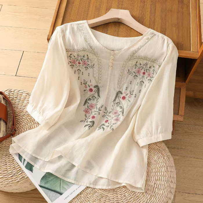 새로운 면화 및 리넨 풀오버 하이 엔드 자수 중국 여성의 느슨한 슬리밍 코튼 및 리넨 티셔츠 여성을위한 올 매치 작은 셔츠