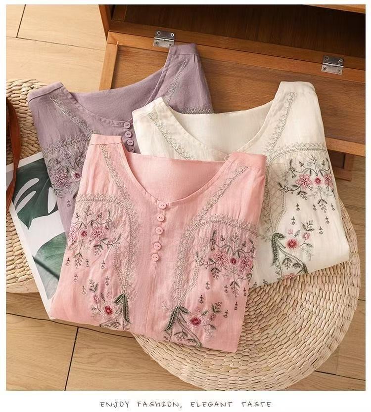 새로운 면화 및 리넨 풀오버 하이 엔드 자수 중국 여성의 느슨한 슬리밍 코튼 및 리넨 티셔츠 여성을위한 올 매치 작은 셔츠스토어 가기