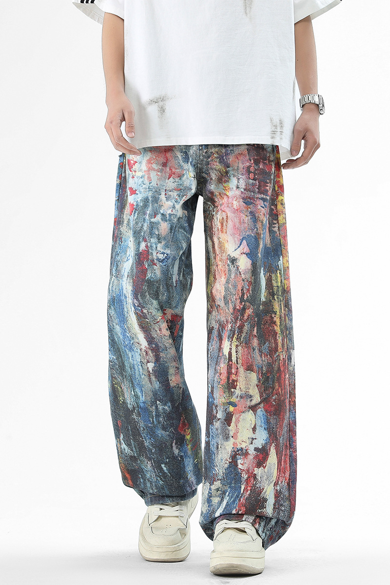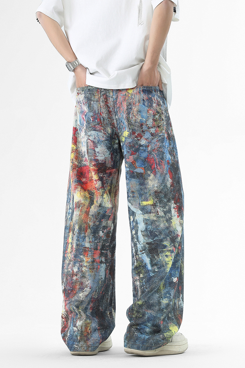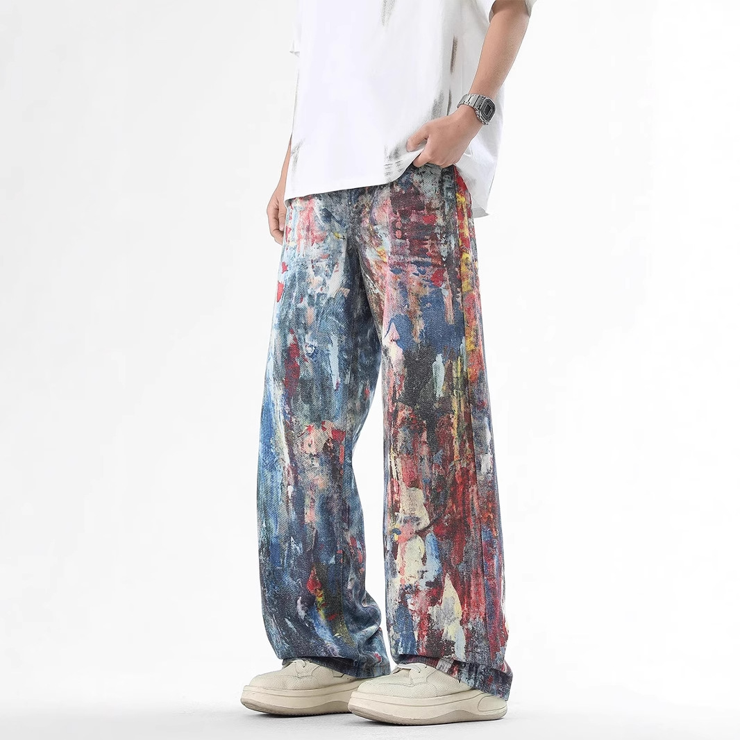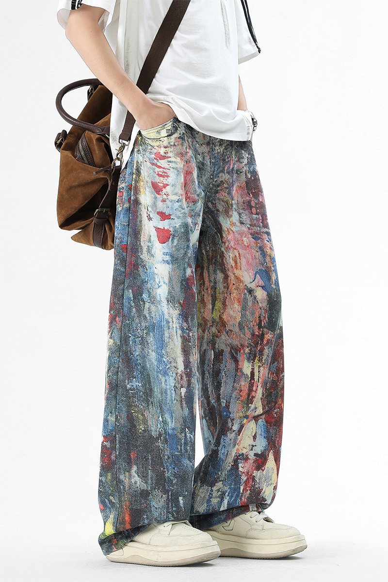 미국식 스트리트 힙합 워싱 데님 팬츠 남성용 헤비급 핸드페인팅 그래피티 루즈핏 찢어진 긴바지 스트레이트 팬츠 트렌디 브랜드