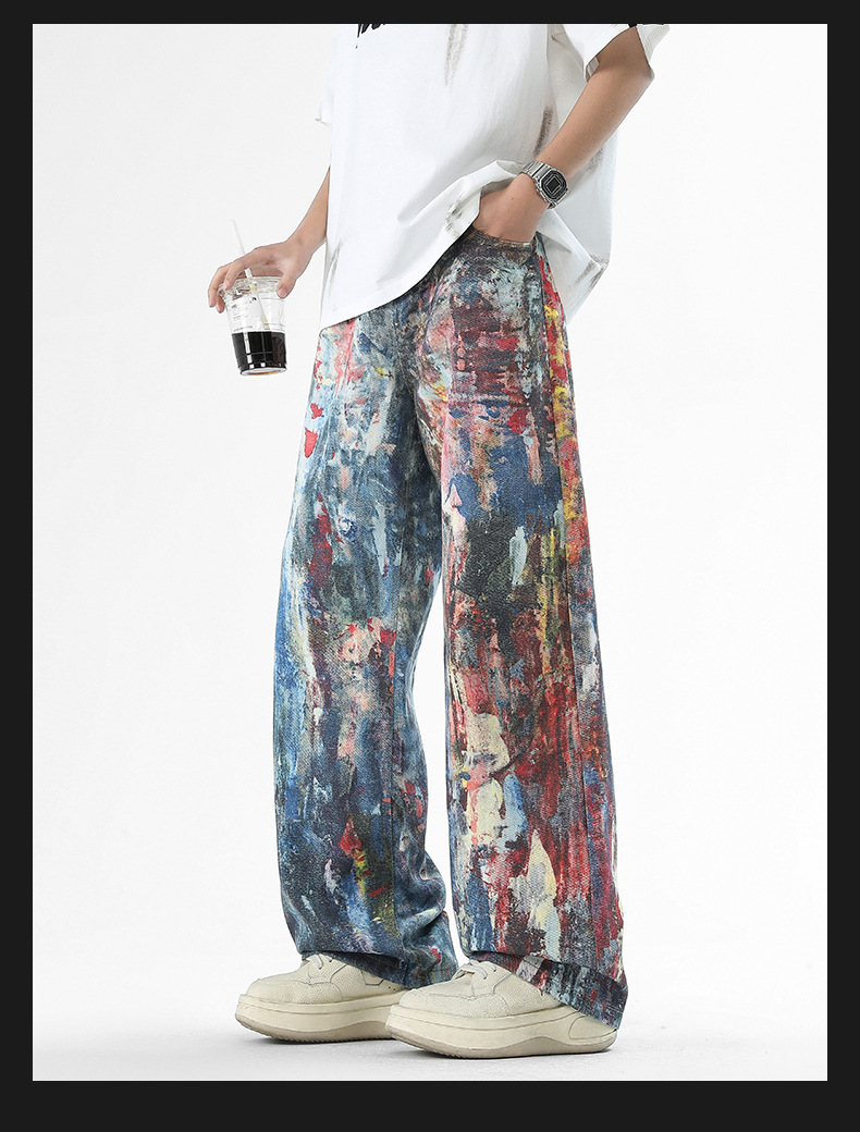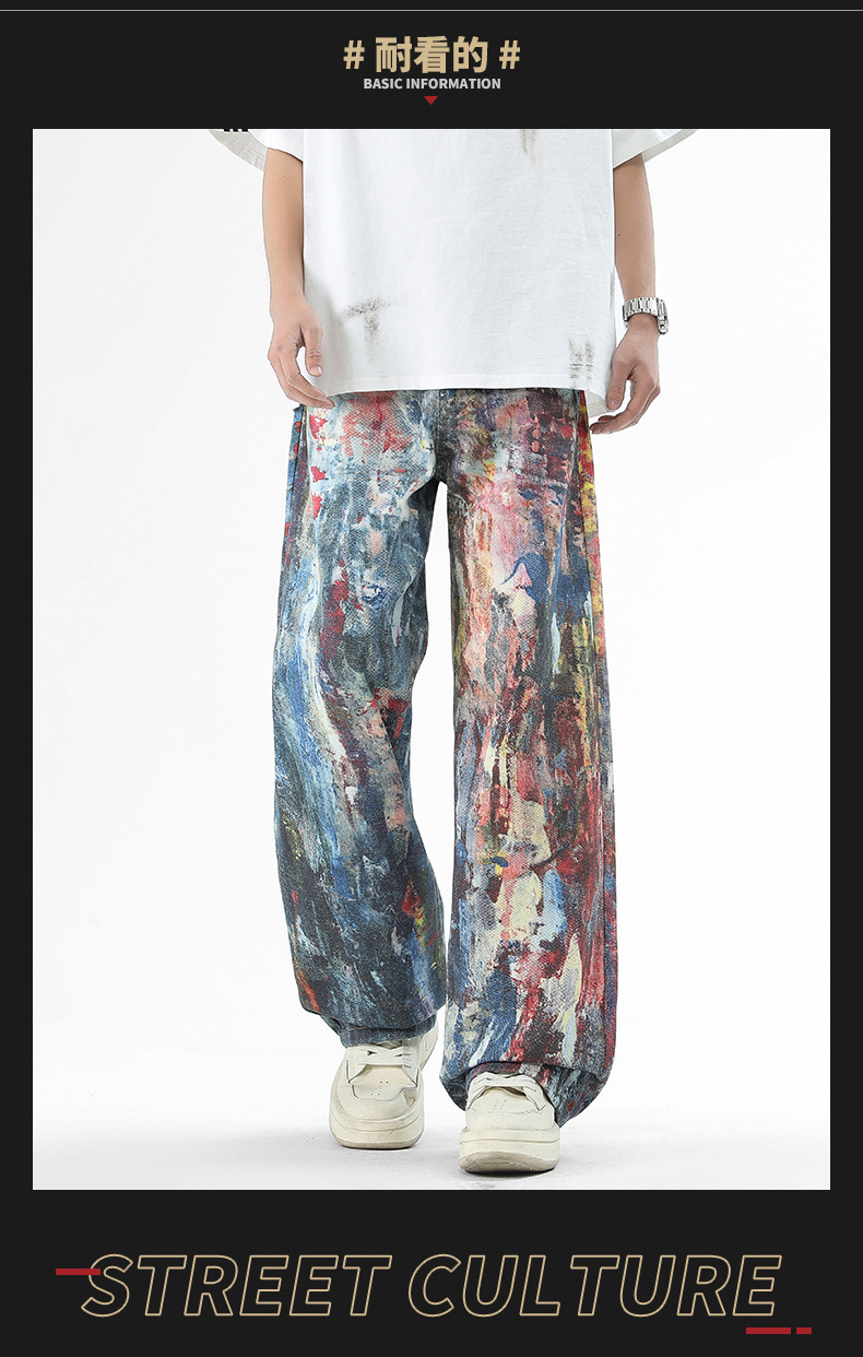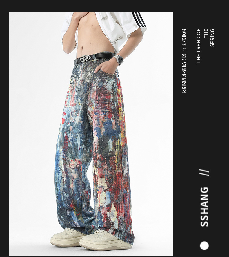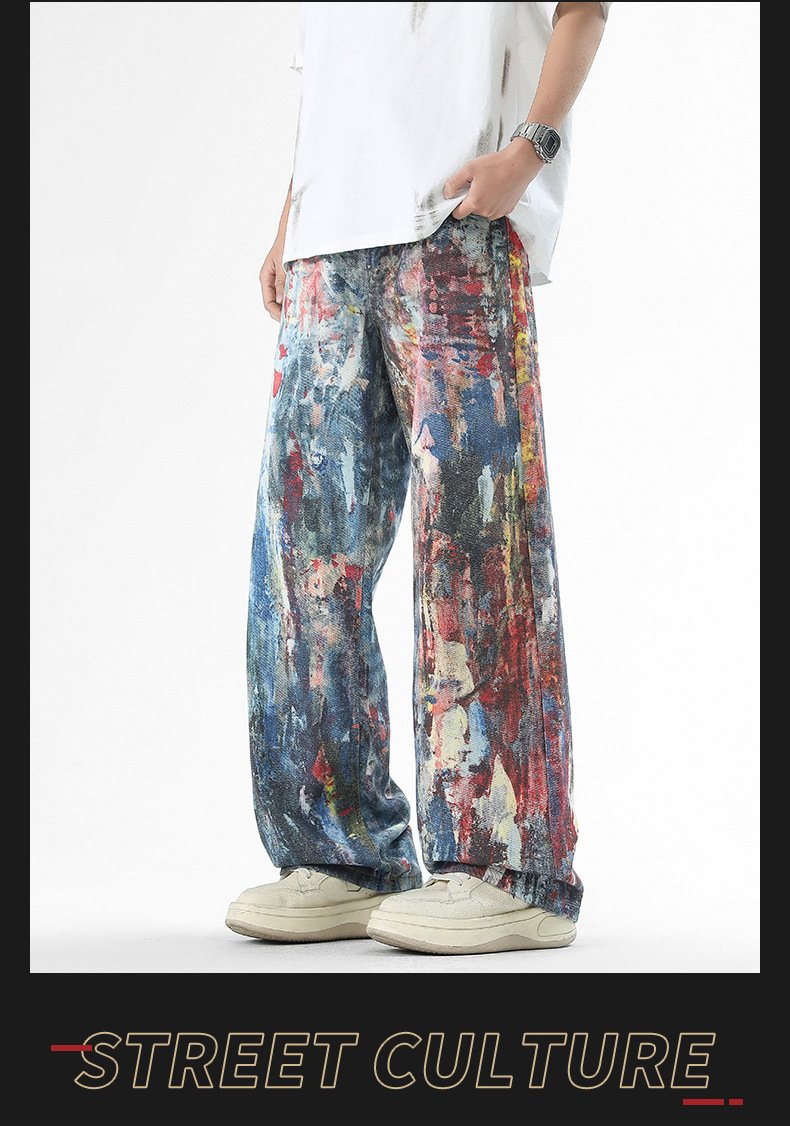 미국식 스트리트 힙합 워싱 데님 팬츠 남성용 헤비급 핸드페인팅 그래피티 루즈핏 찢어진 긴바지 스트레이트 팬츠 트렌디 브랜드스토어 가기