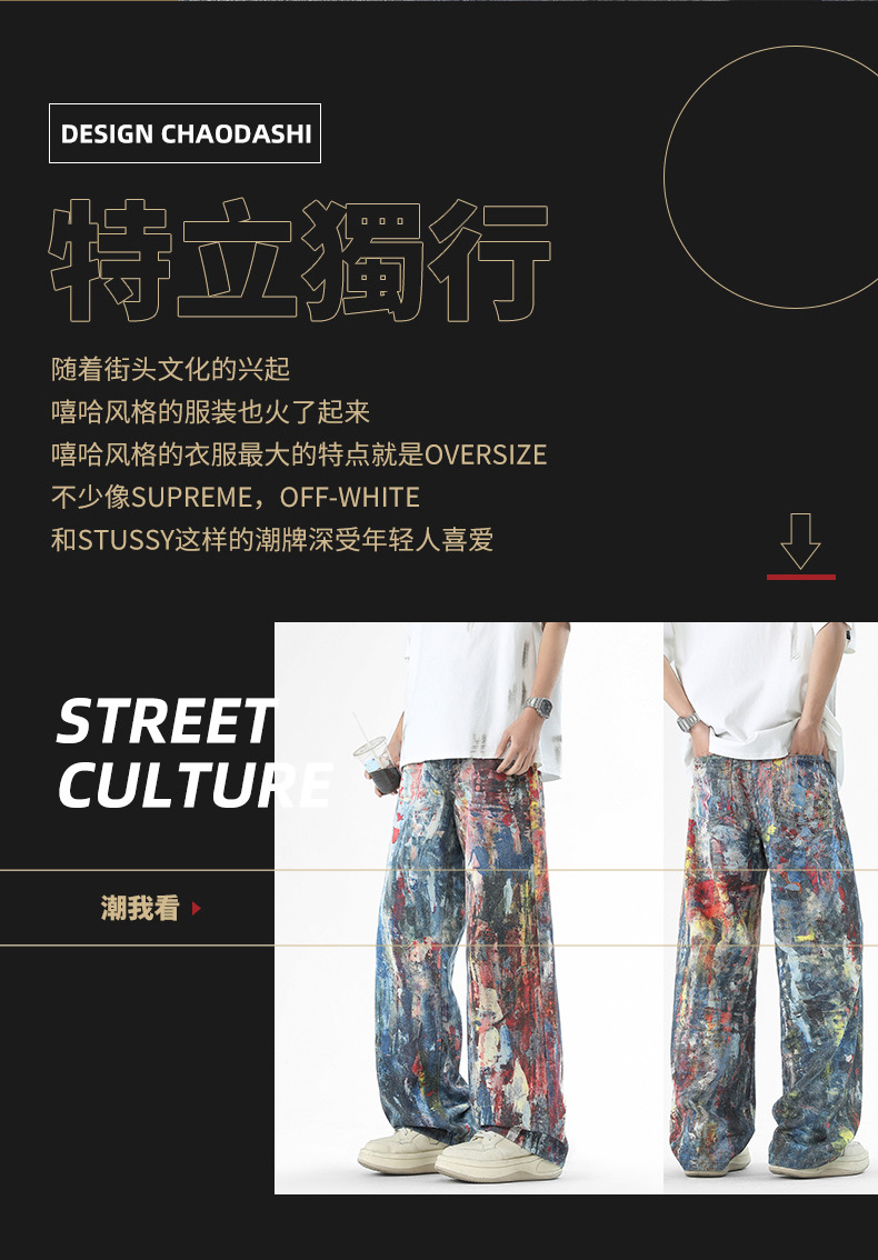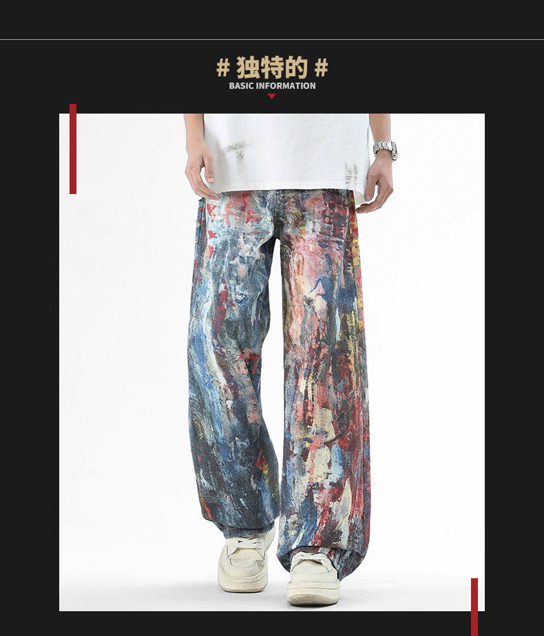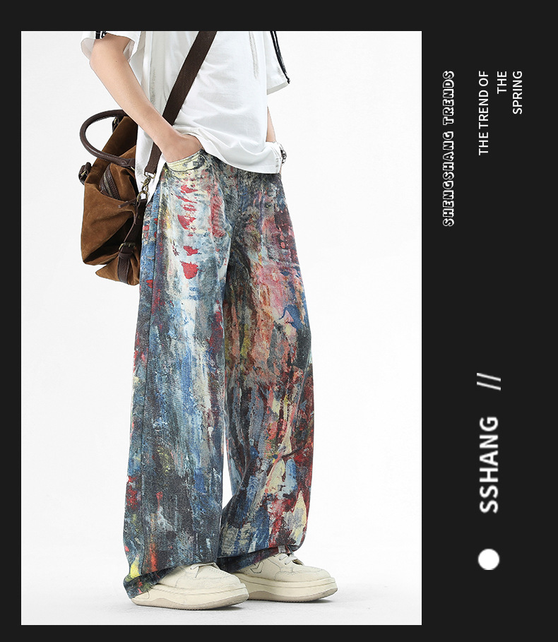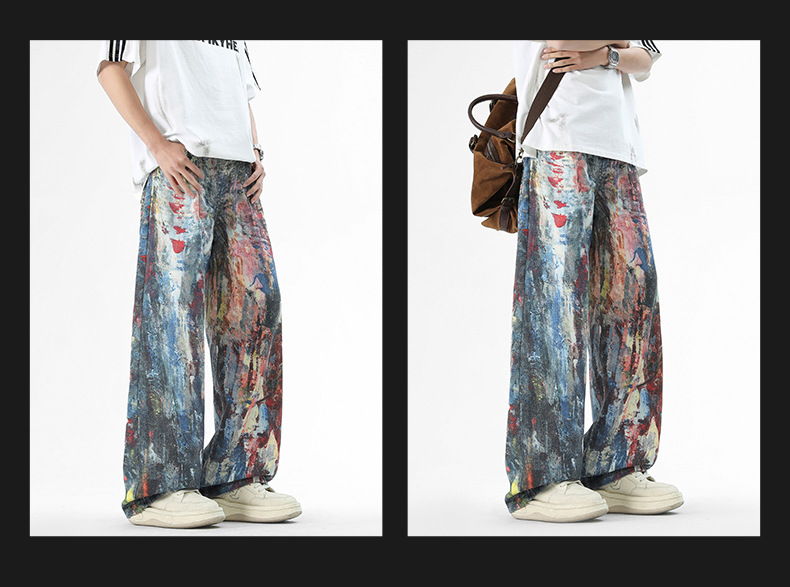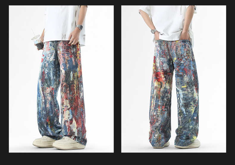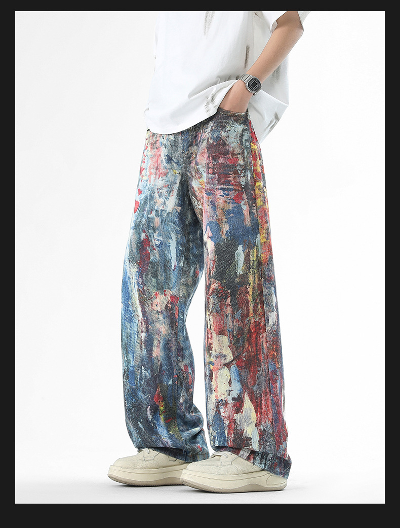 미국식 스트리트 힙합 워싱 데님 팬츠 남성용 헤비급 핸드페인팅 그래피티 루즈핏 찢어진 긴바지 스트레이트 팬츠 트렌디 브랜드스토어 가기