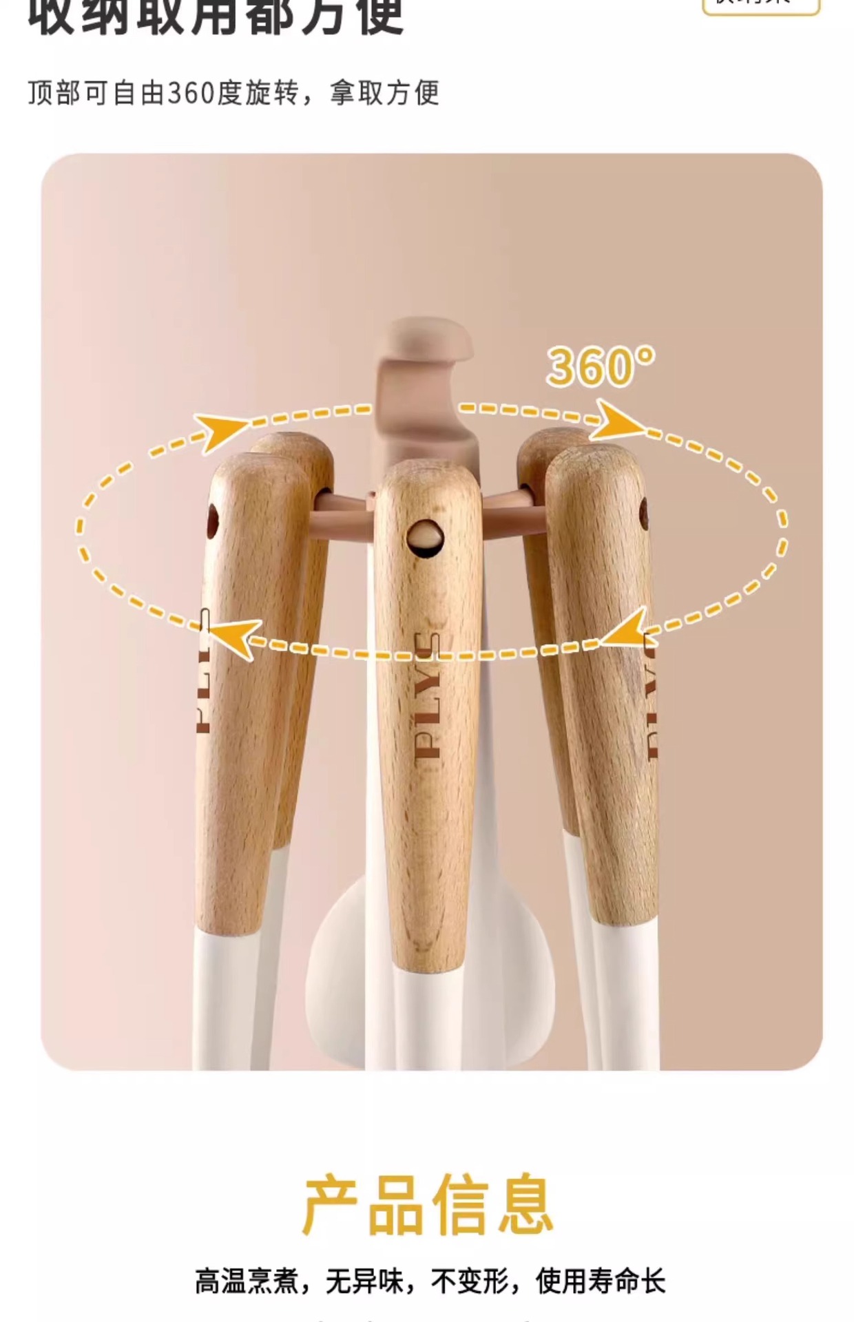• 유백색 실리콘 나무 손잡이 (주걱 + 튀김 주걱 + 수프 스푼 + 소쿠리) + 유백색 스탠드
