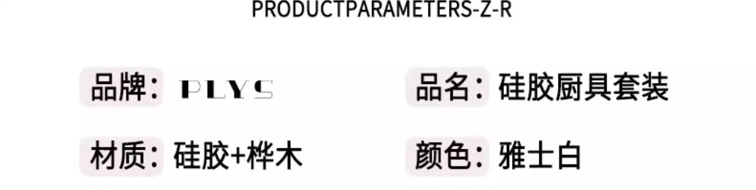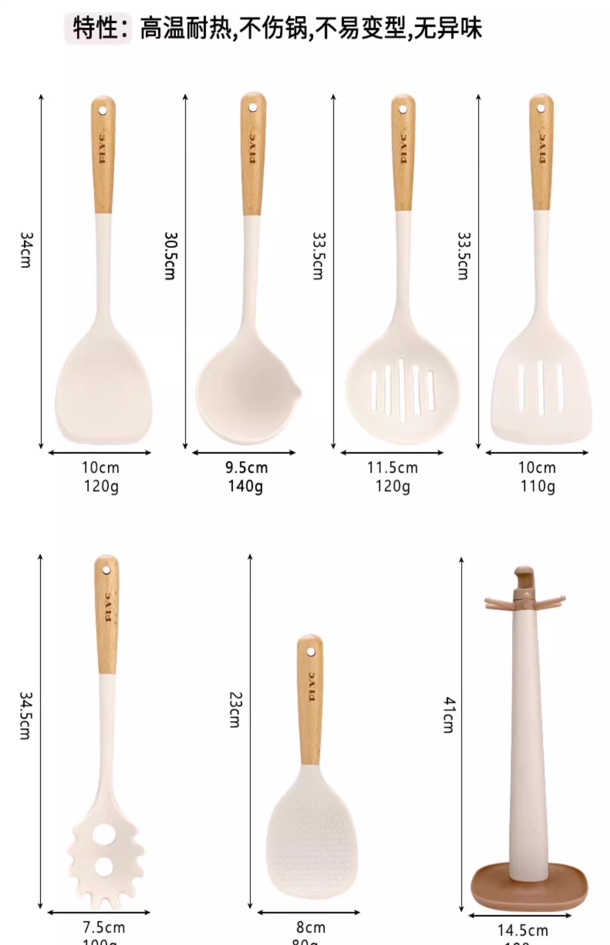 • 유백색 실리콘 나무 손잡이 (주걱 + 수프 스푼 + 소쿠리) + 유백색 실리콘 클립 + 유백색 스탠드