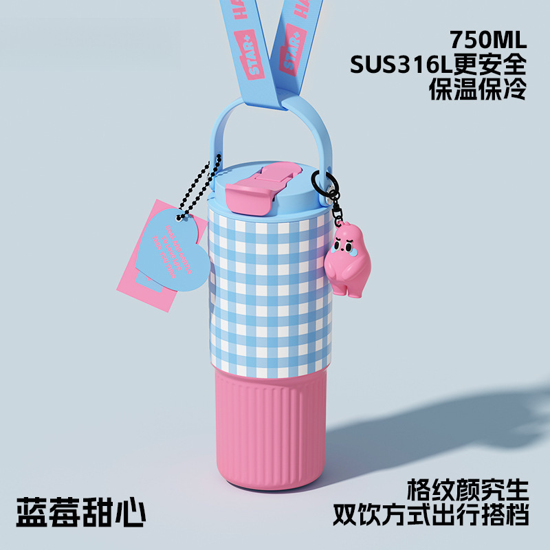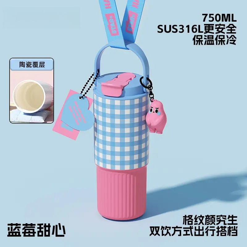 • 블루베리 연인◆750ML【편안한 어깨끈 포함✚인형 펜던트✚밀짚 브러시 컵 브러시✚316 스테인레스 스틸 라이너]