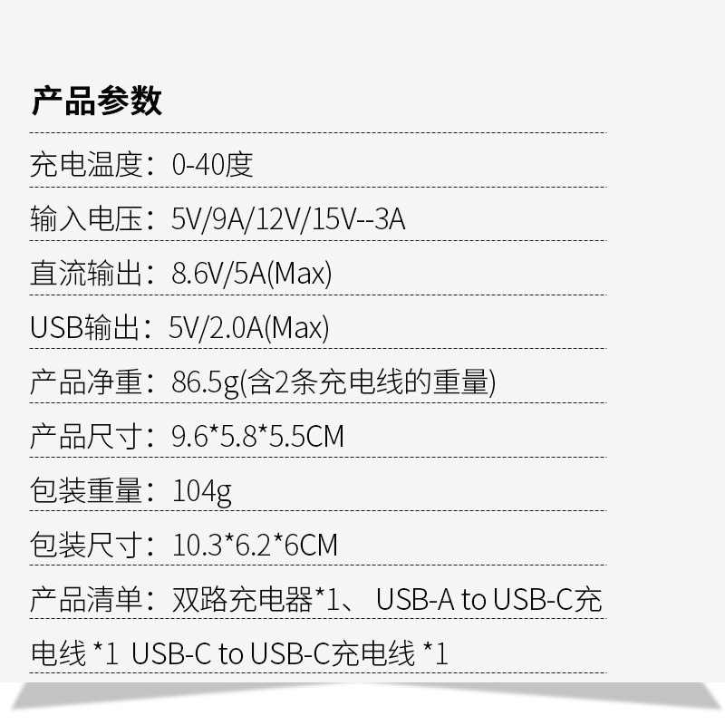产品清单:双路充电器*1、 USB-A to USB-C充电线 *1 USB-C to USB-C充电线 *1