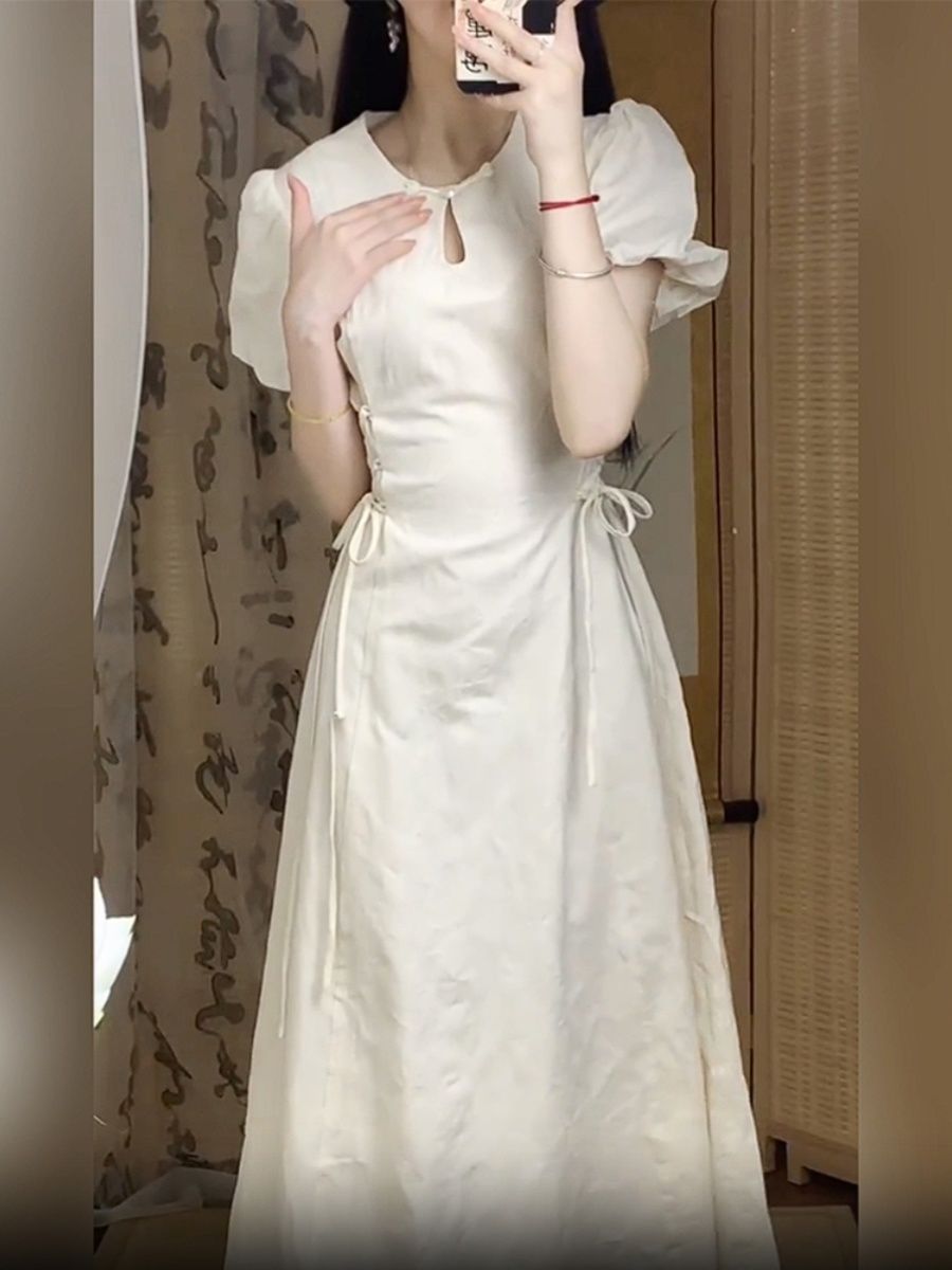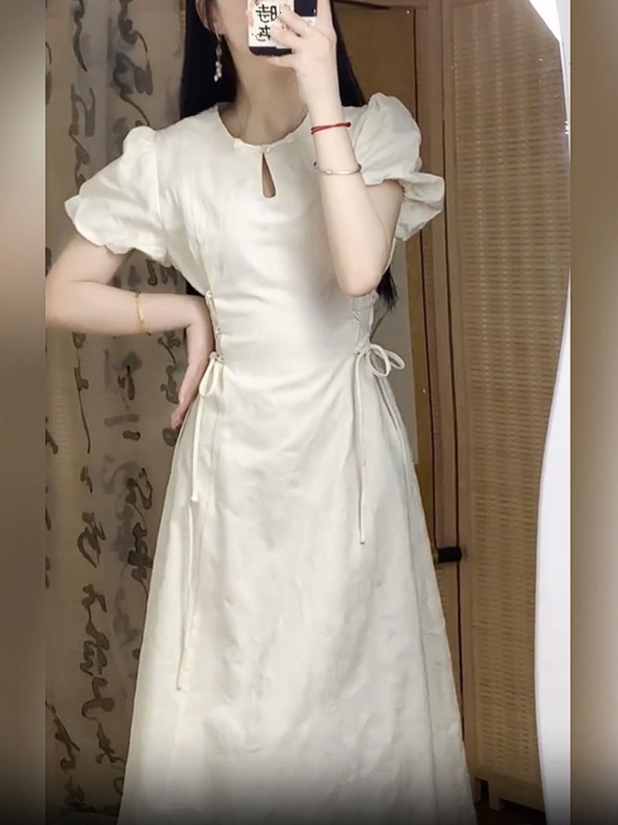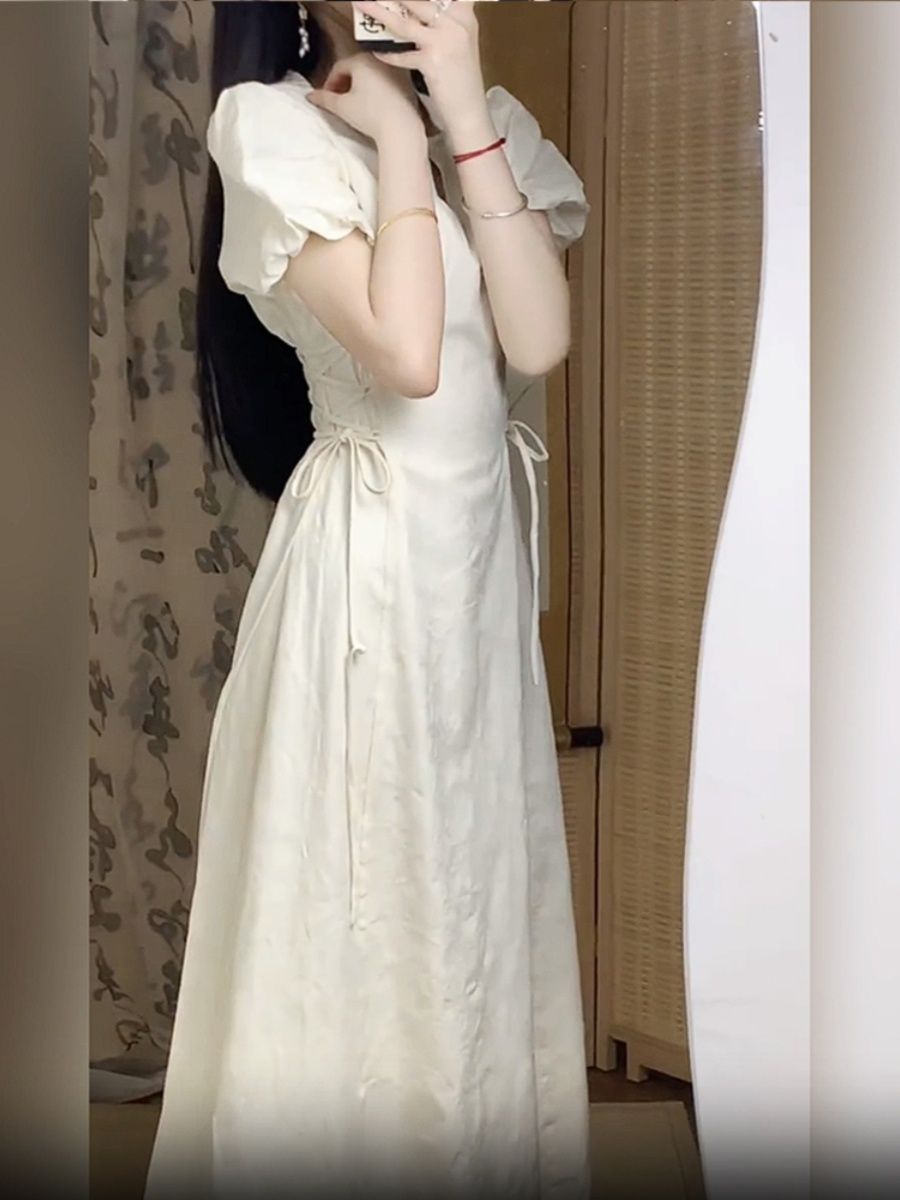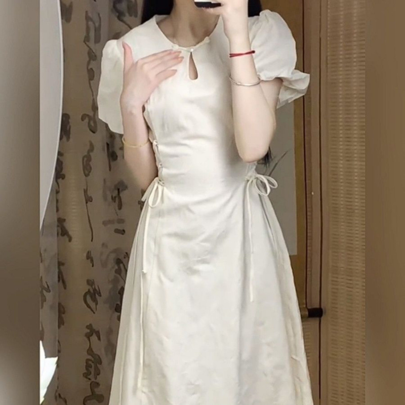 여름 새로운 프랑스 스타일 첫사랑 Platycodon Grandiflorum 원피스 여성 학생 대학 스타일 올 매치 중간 길이의 퍼프 슬리브 오버 무릎 원피스스토어 가기