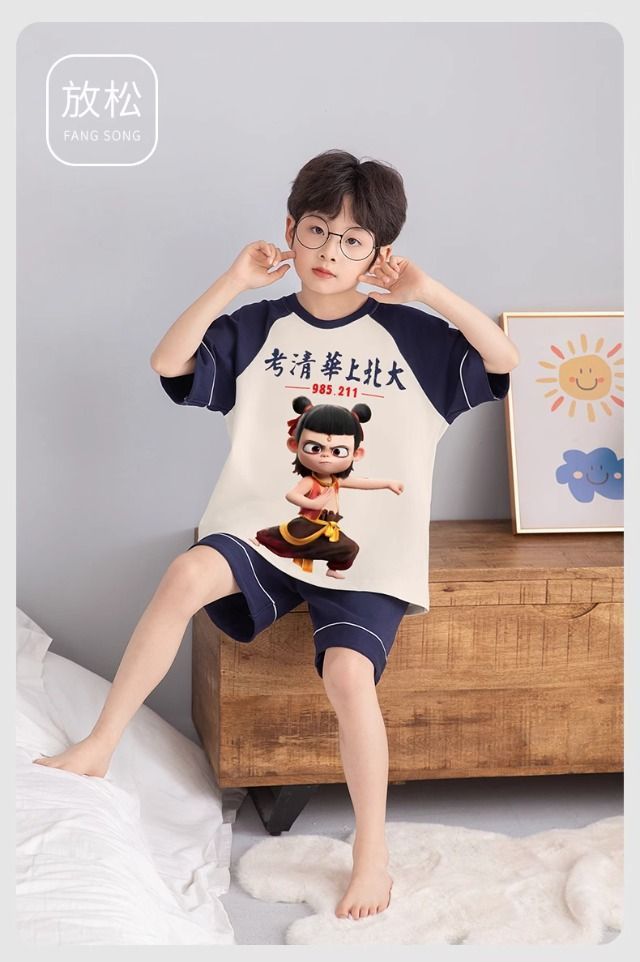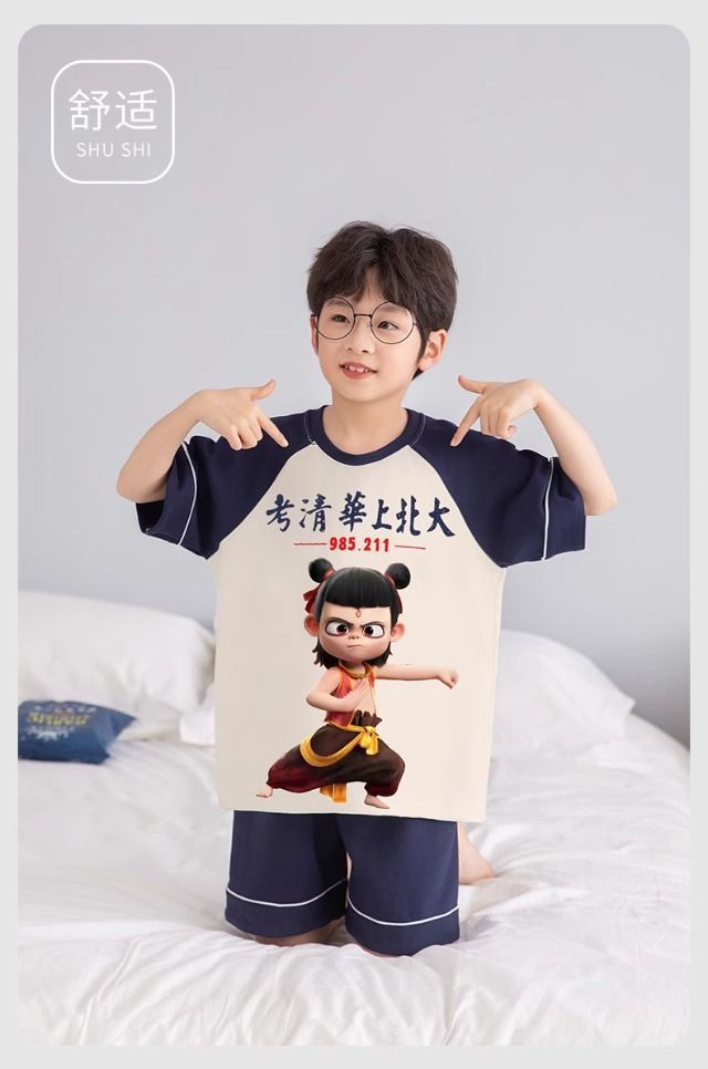 가정 의류 새로운 스타일 소년 잠옷 어린이 만화 Nezha 소년 반팔 반바지 여름 정장 가정용