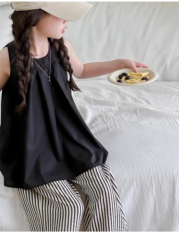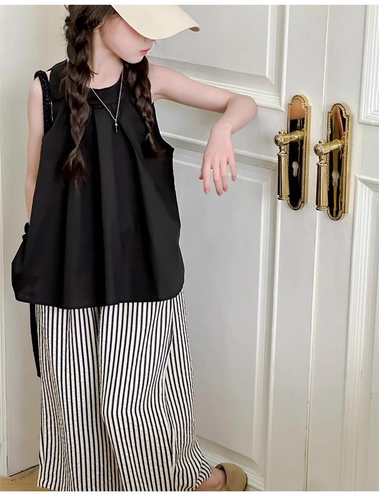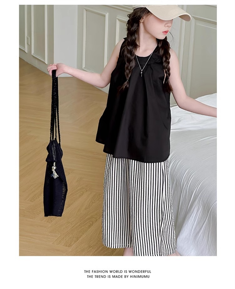 소녀 줄무늬 바지 세트 여름 얇은 서양 스타일 큰 어린이 검은 색 민소매 탑 느슨한 자른 바지 투피스 세트