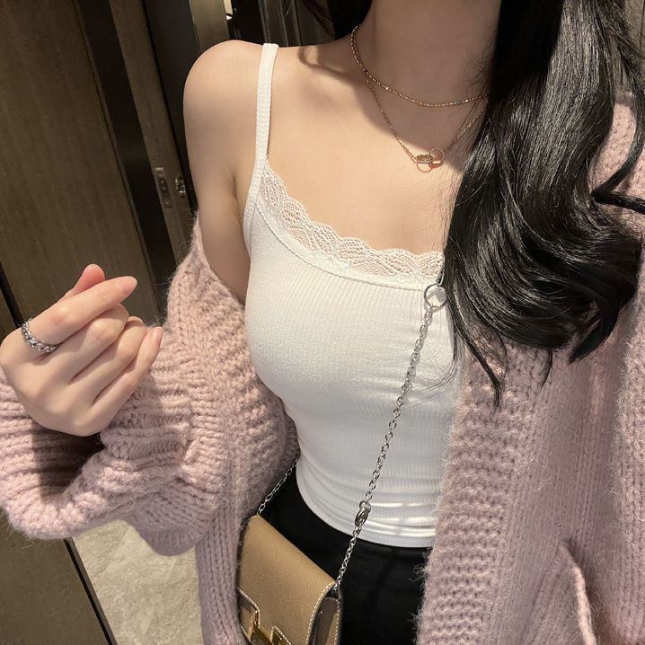 봄과 여름 새로운 달콤한 매운 조끼 작은 슬링 여성 레이스 엣지베이스 셔츠 분위기 내부 슬림 아이스 실크 탑스토어 가기