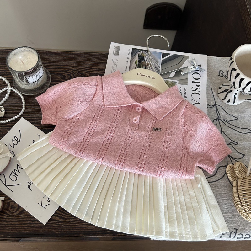 한국 아동복 2025 새로운 여름 소녀 니트 반팔 폴로 셔츠 아이보리 주름 치마 스커트 바지 투피스 세트스토어 가기