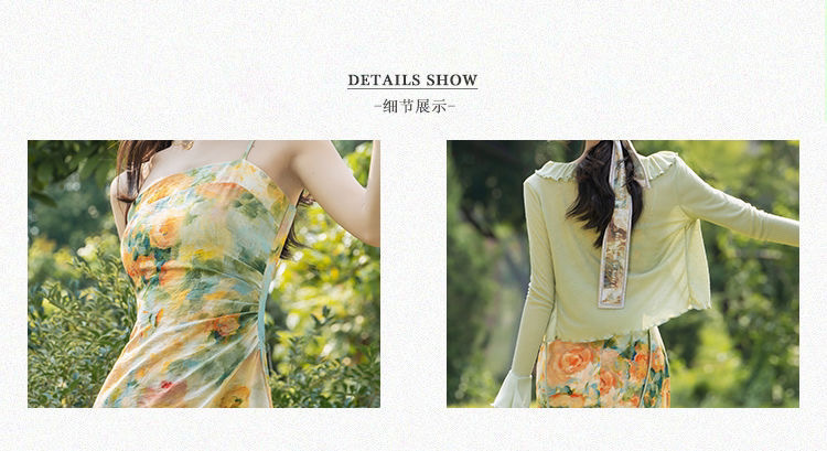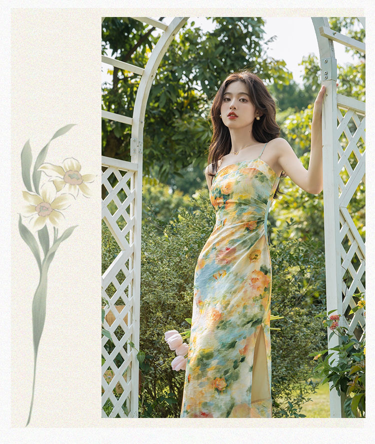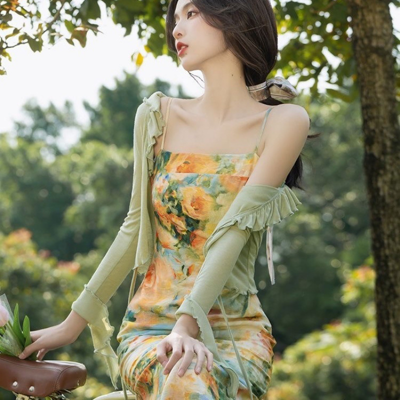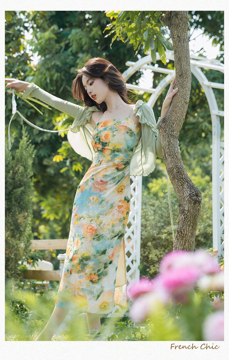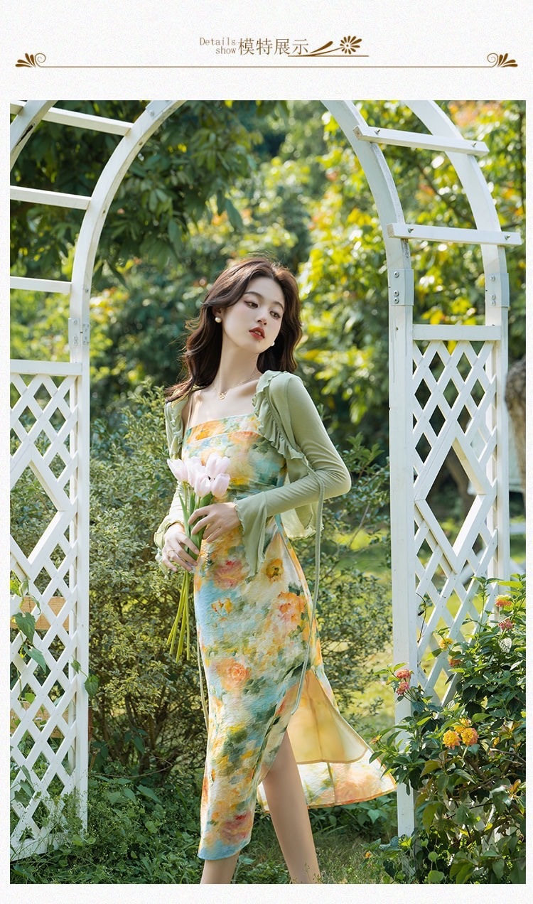 새로운 프랑스 스타일 빈티지 슬링 유화 인쇄 원피스 하이 엔드 달콤한 슈퍼 요정 모리 스타일 첫사랑 요정 원피스