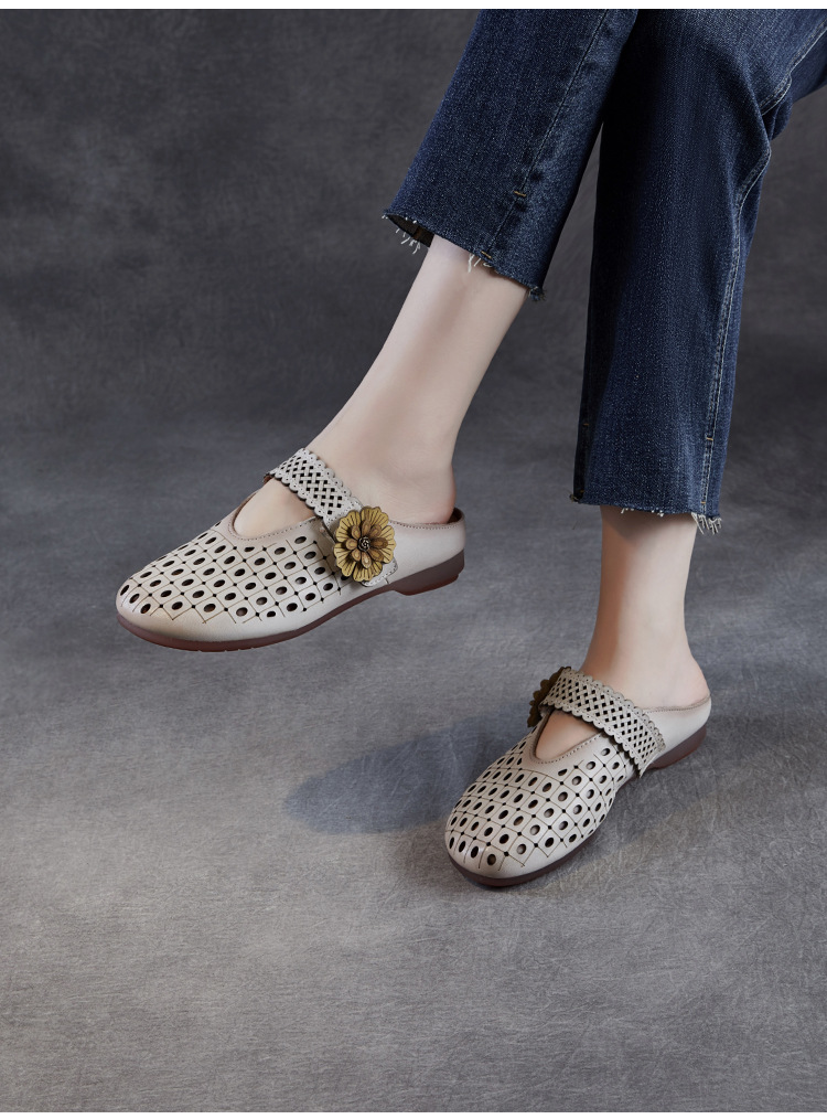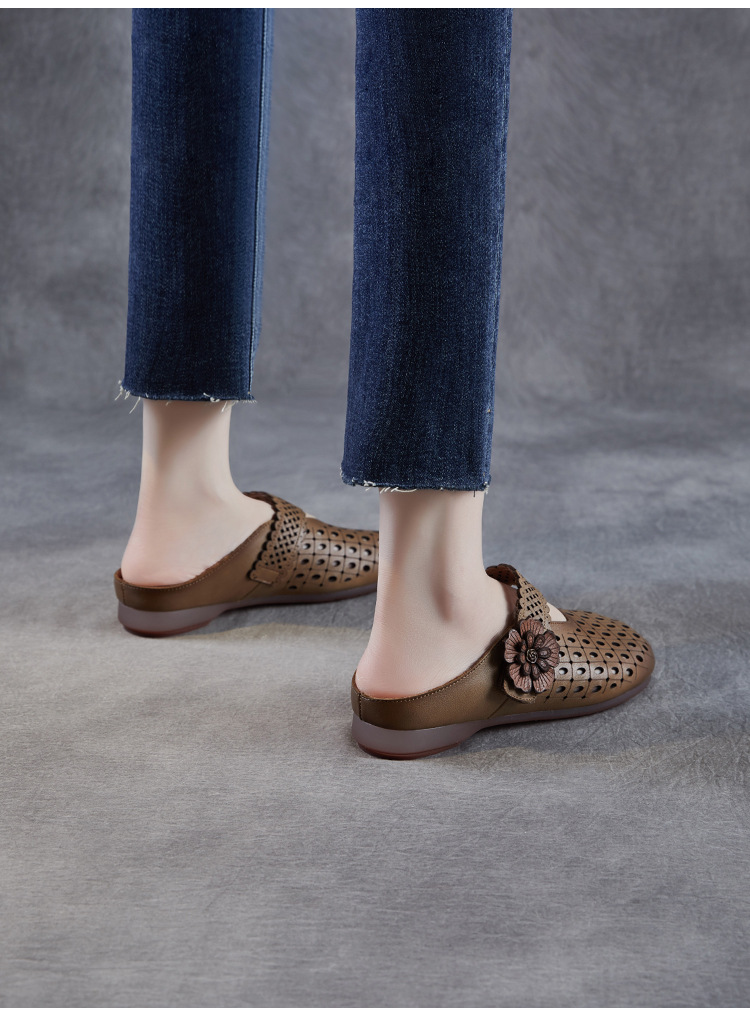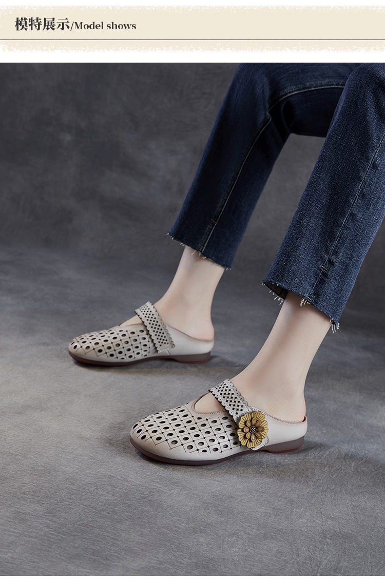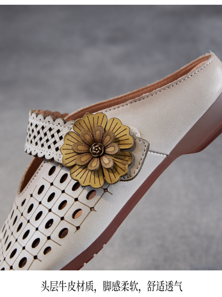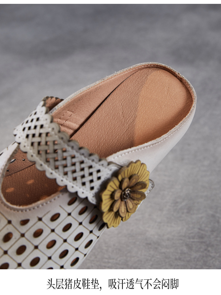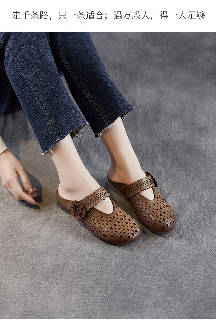여성 1 층 소 가죽 샌들 부드러운 바닥 부드러운 표면 평평한 힐 새로운 하프 슬립 바깥 쪽 속이 빈 민족 스타일의 빈티지 슬리퍼