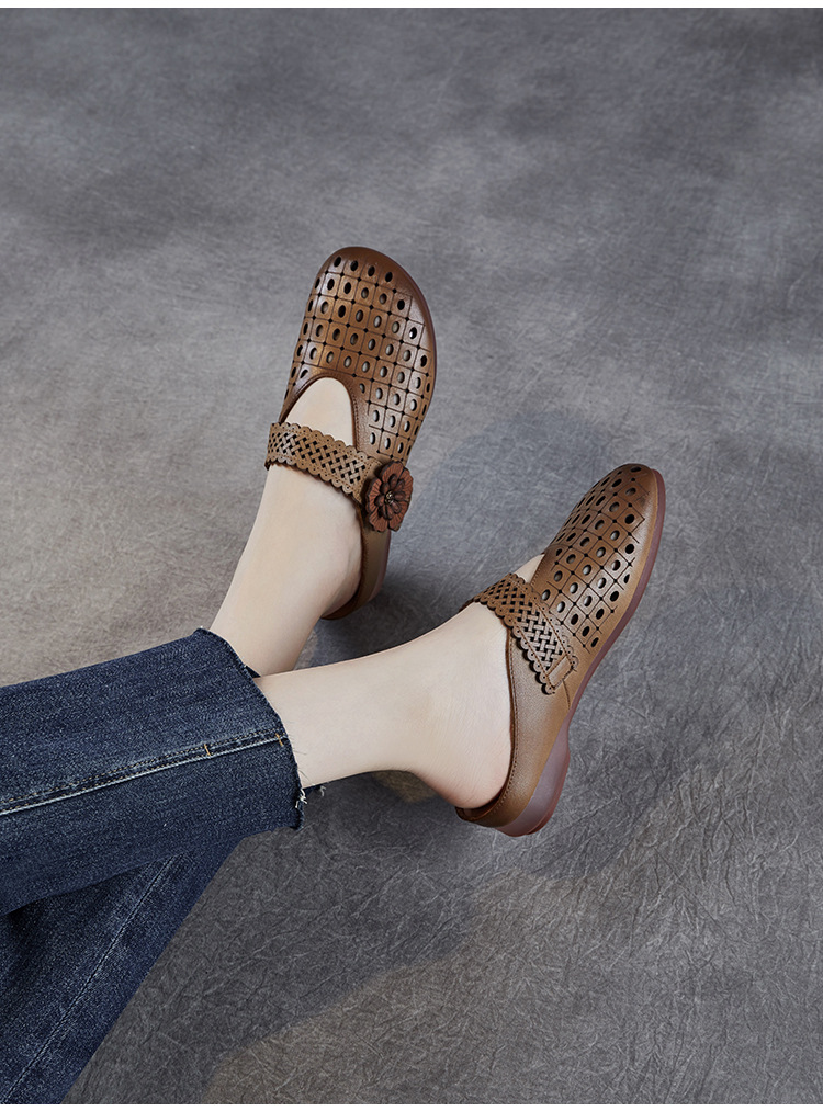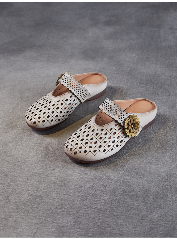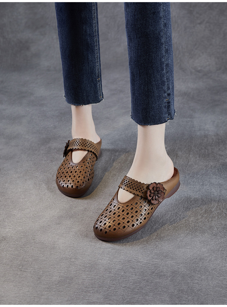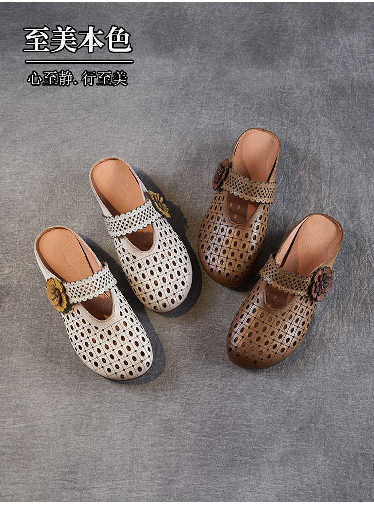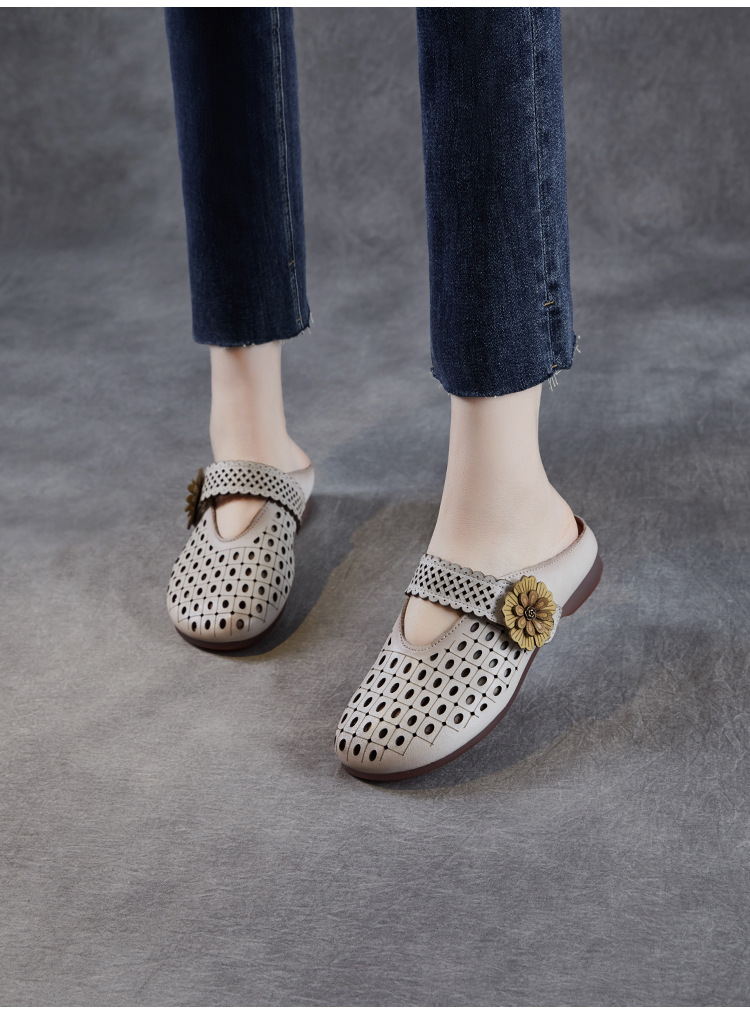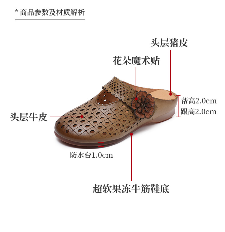 여성 1 층 소 가죽 샌들 부드러운 바닥 부드러운 표면 평평한 힐 새로운 하프 슬립 바깥 쪽 속이 빈 민족 스타일의 빈티지 슬리퍼