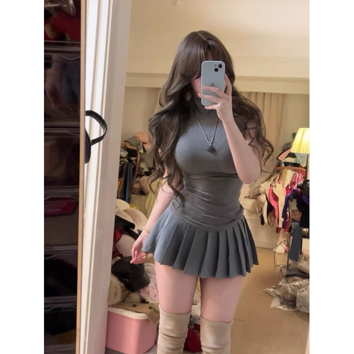 미국 스타일의 뜨거운 소녀 민소매 최고 슬림 핏 짧은 조끼 외부 착용 높은 허리 슬림 핏 스커트 짧은 치마 세트 여성 여름스토어 가기