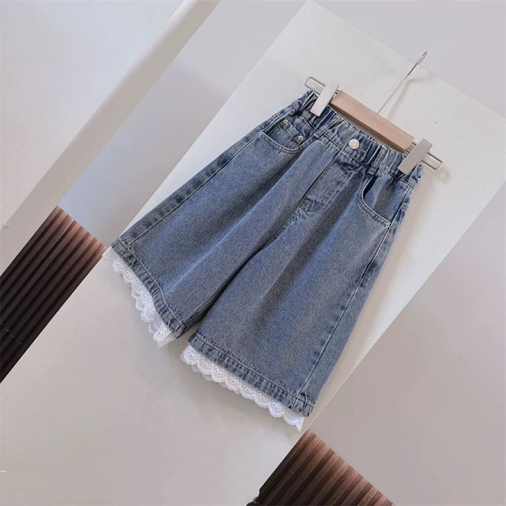 한국 스타일 높은 허리 구슬 레이스 바느질 활 느슨한 스트레이트 블루 데님 바지 소녀 바지