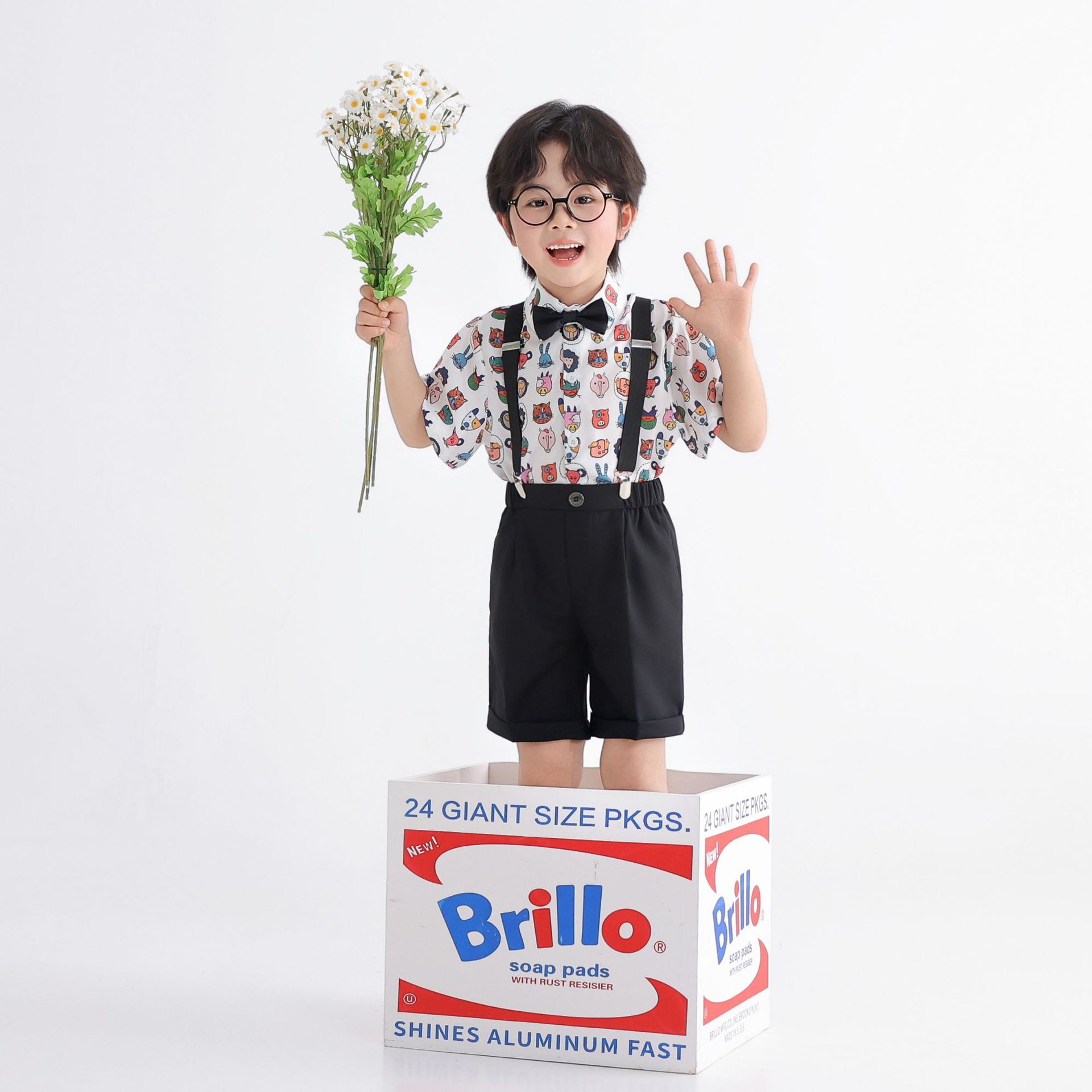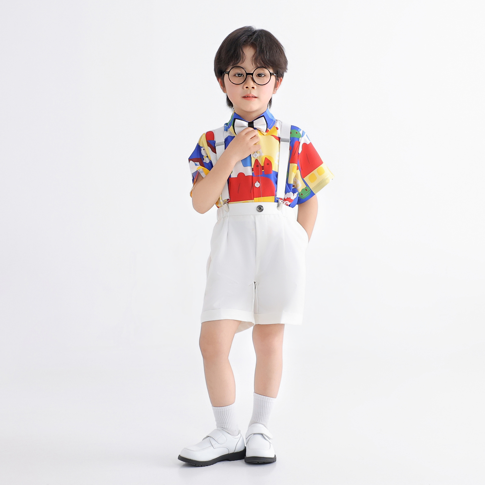 • 오렌지 동물원 반팔 + 블랙 반바지 + 블랙 멜빵 + 블랙 나비넥타이