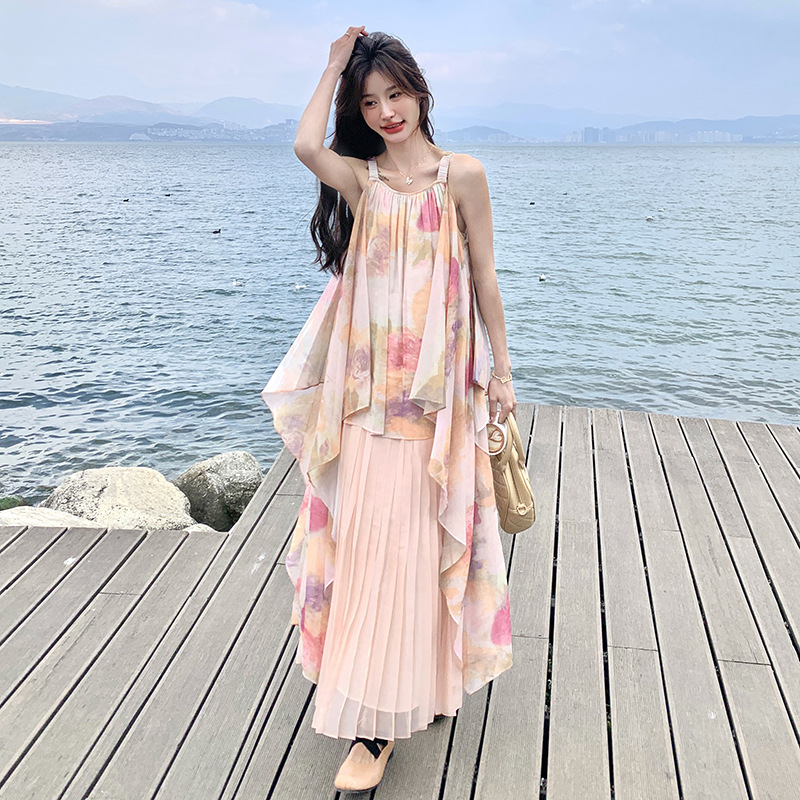 리얼 샷 프랑스 분위기 유화, 2025 원피스 새로운 기질 휴가 스타일 가짜 두 주름 원피스스토어 가기