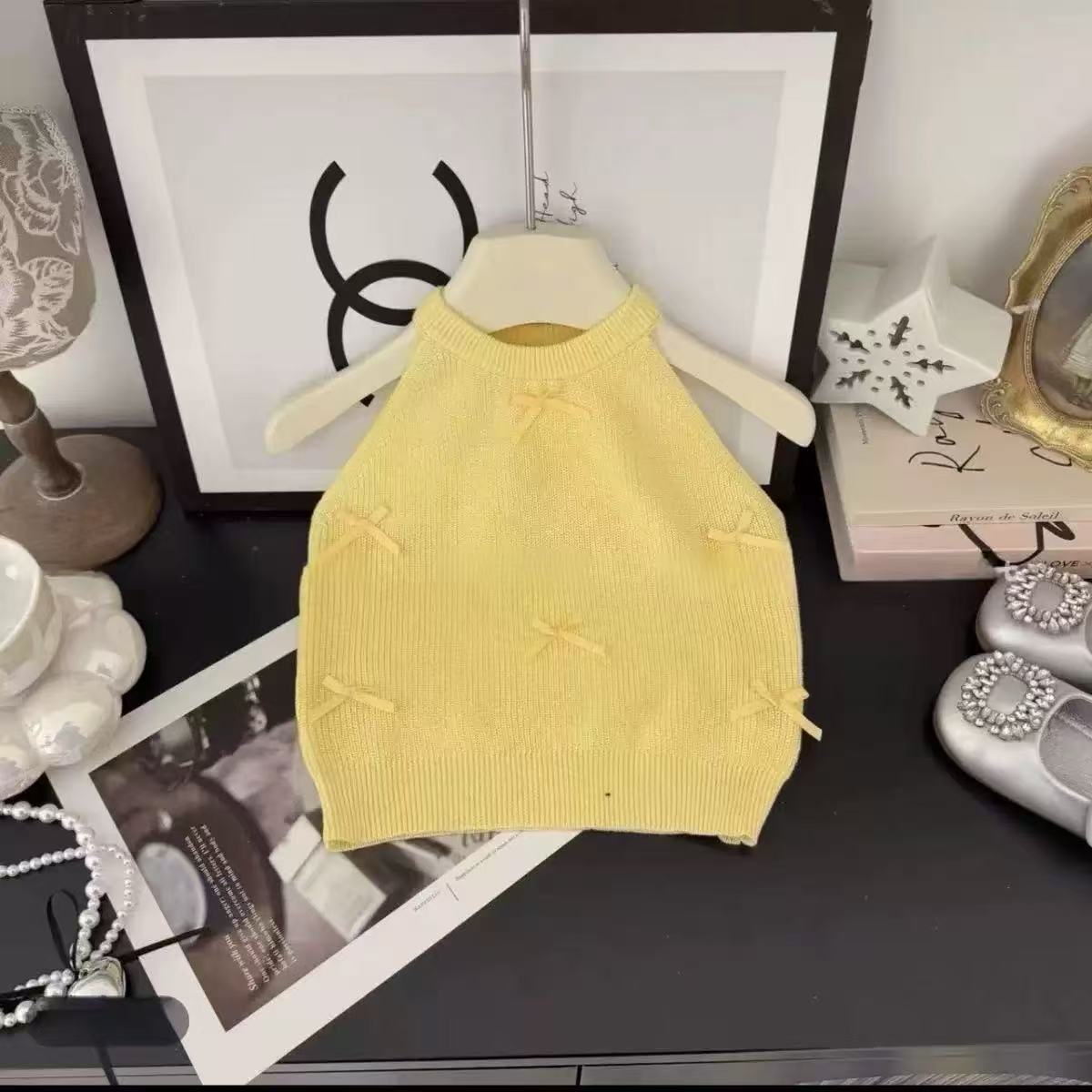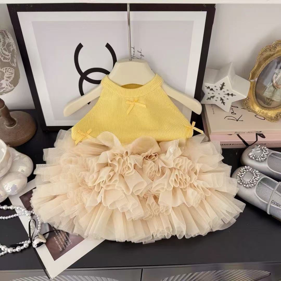 소녀 2025 여름 새로운 도착 유행 아기 소녀 니트 보우 슬링 올 매치 메쉬 투투 스커트 2 피스 세트