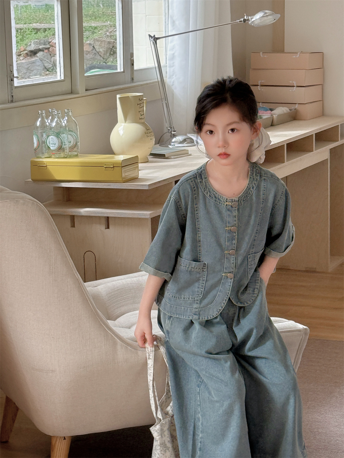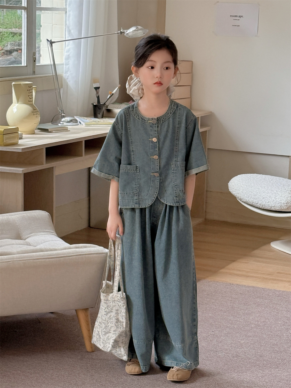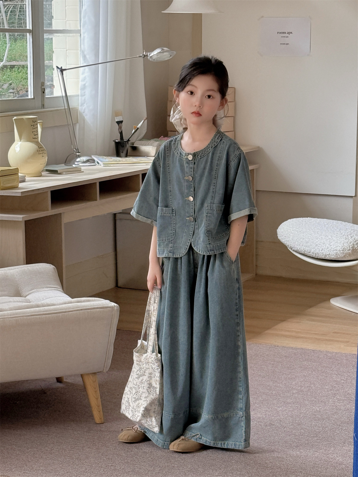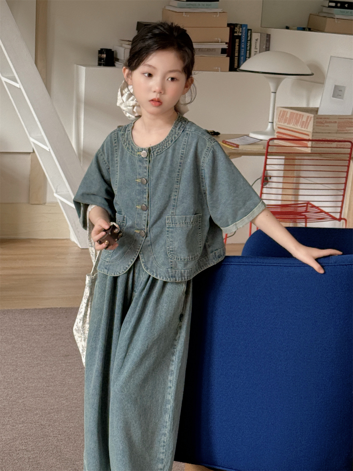 꽃과 추구 아동복 소녀 데님 2025 세트 여름 새로운 어린이 여름 서양식 데님 중소매 투피스 세트스토어 가기