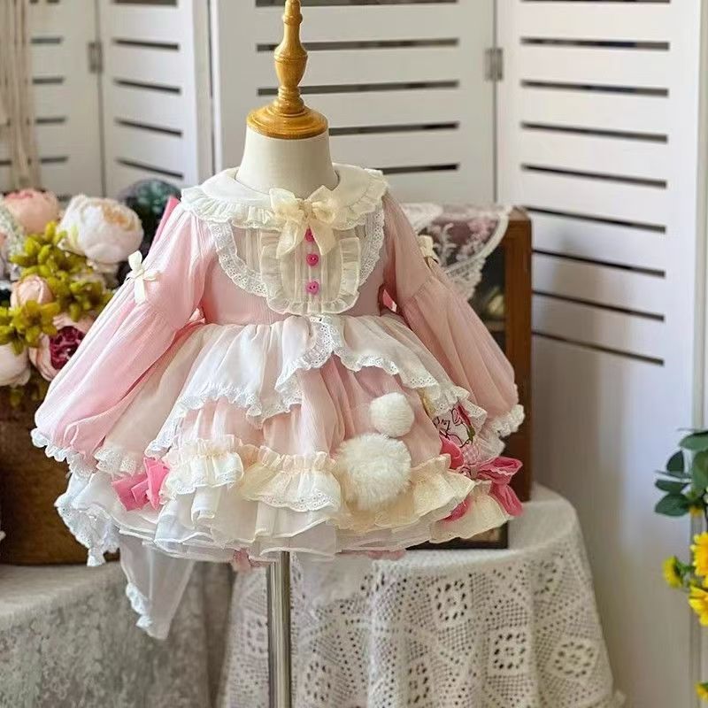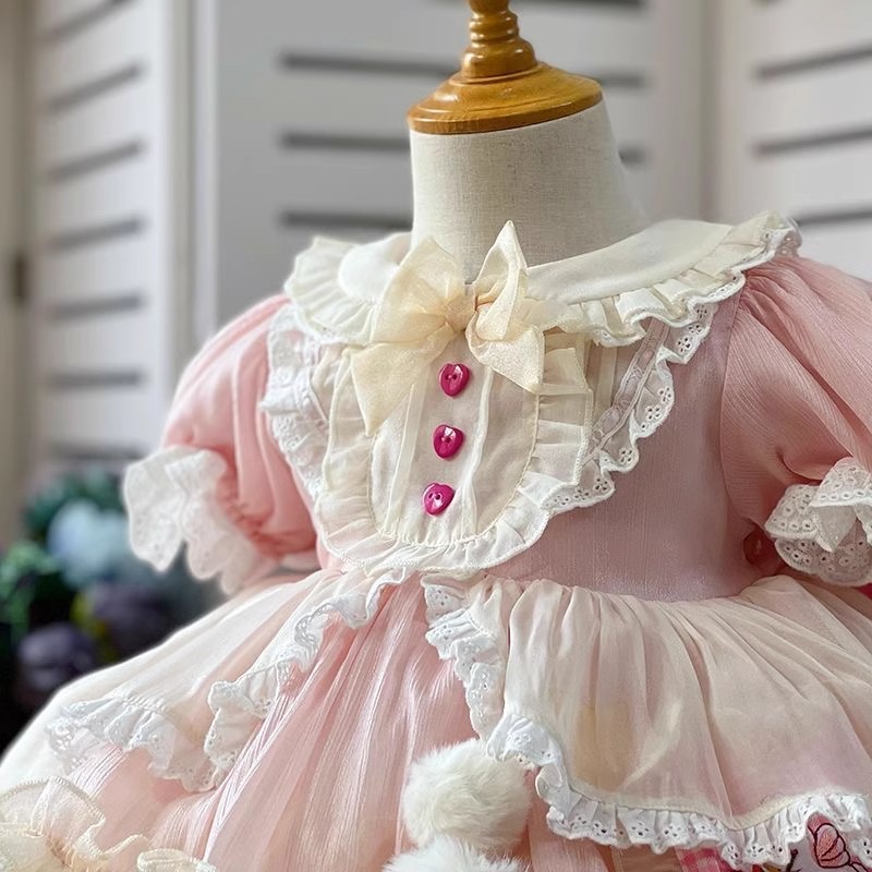 여자 로리타 핑크 푹신한 공주 원피스 반팔 한 살짜리 아기 소녀 원피스 원피스 원피스 궁전 스타일 원피스