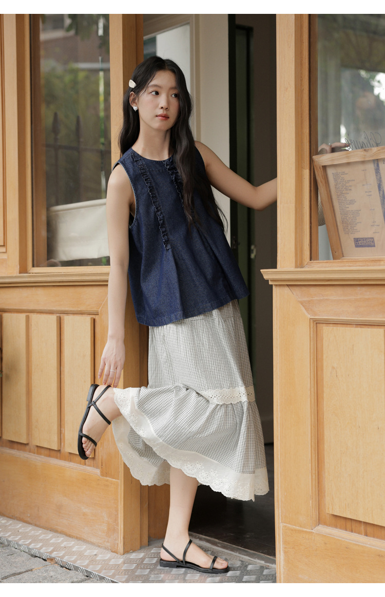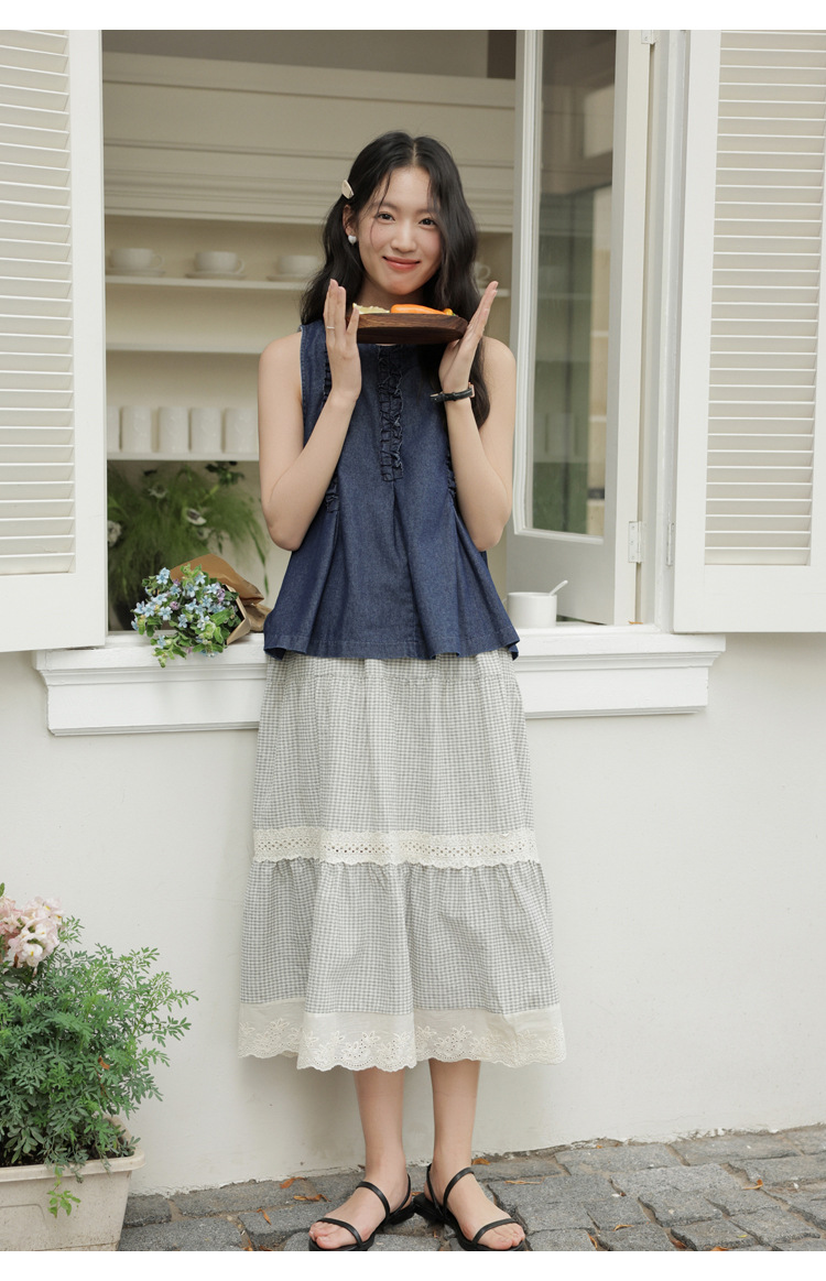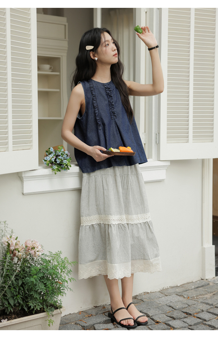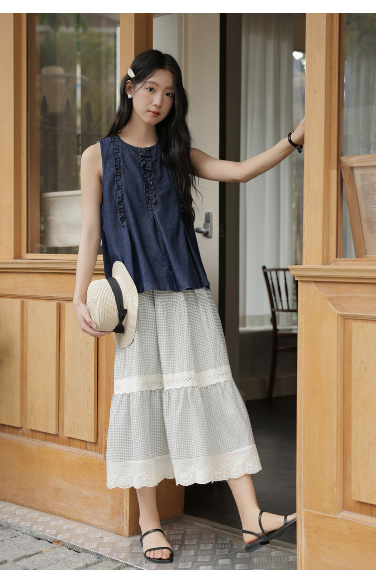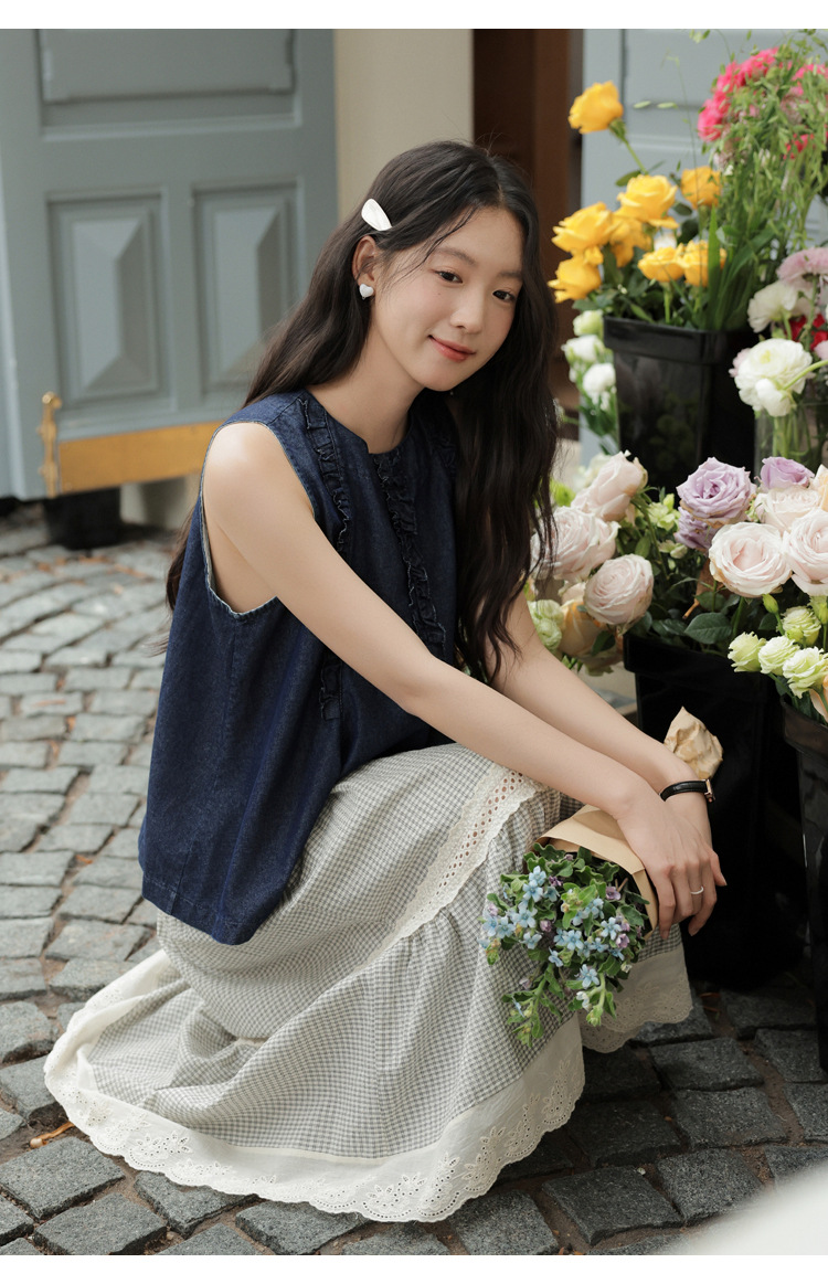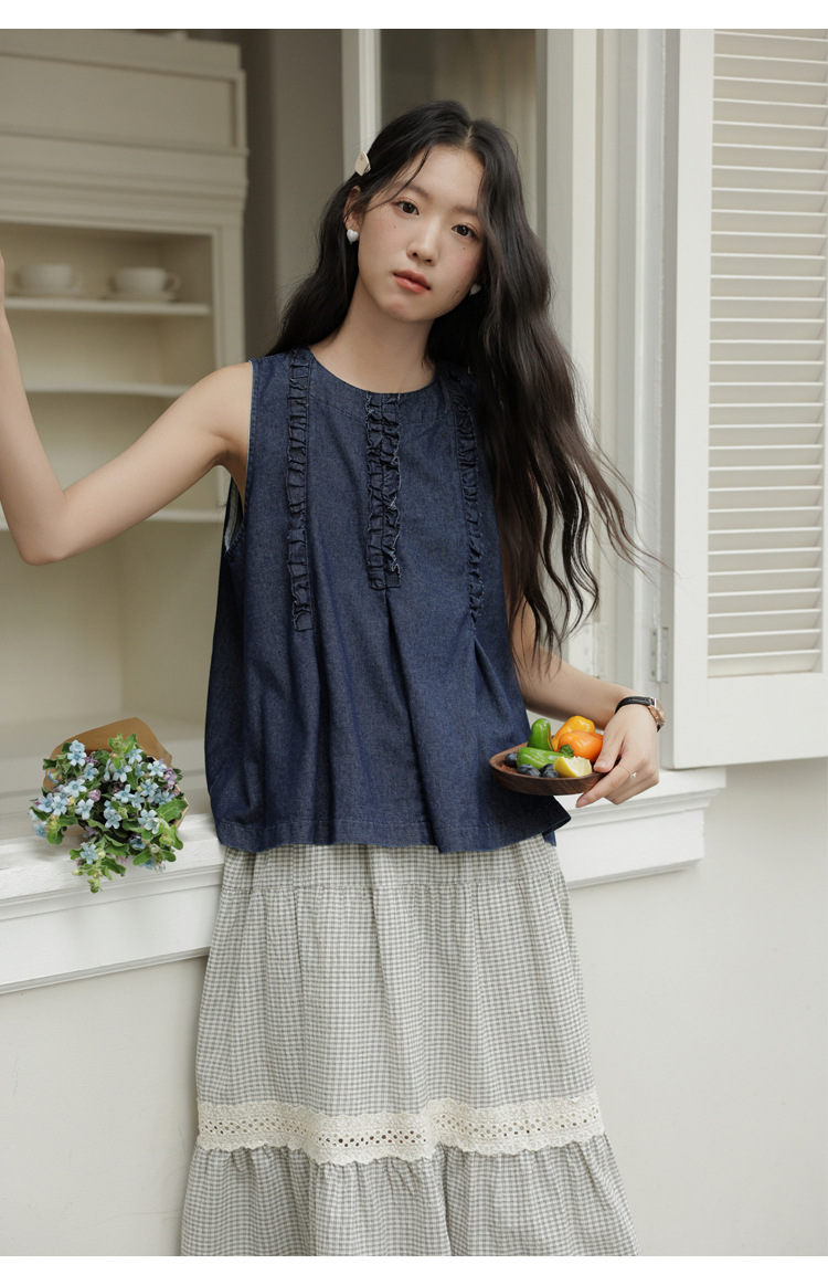 2025 여름 새로운 한국 스타일 오리지널 컬러 블루 세련된 디자인 바느질 귀 가장자리 데님 조끼 여성용 민소매 셔츠스토어 가기