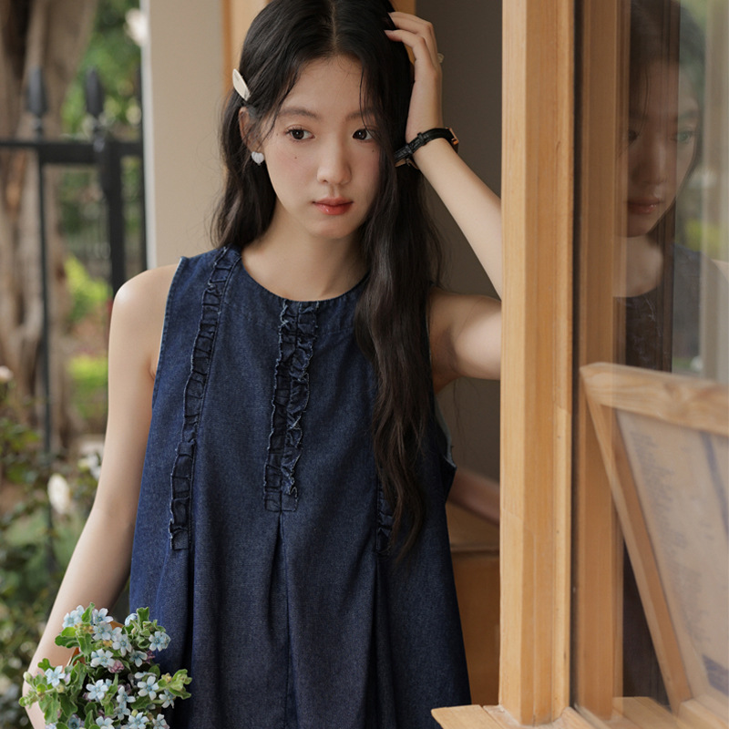 2025 여름 새로운 한국 스타일 오리지널 컬러 블루 세련된 디자인 바느질 귀 가장자리 데님 조끼 여성용 민소매 셔츠