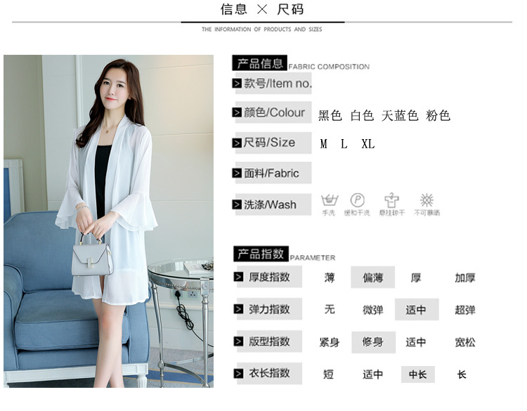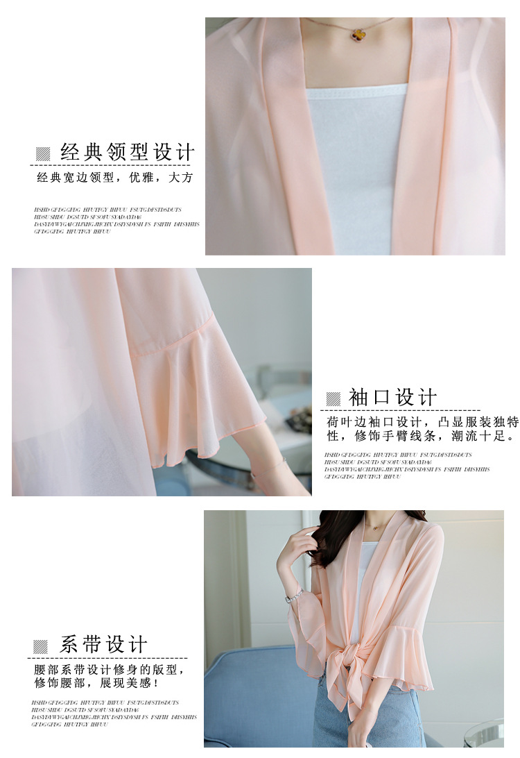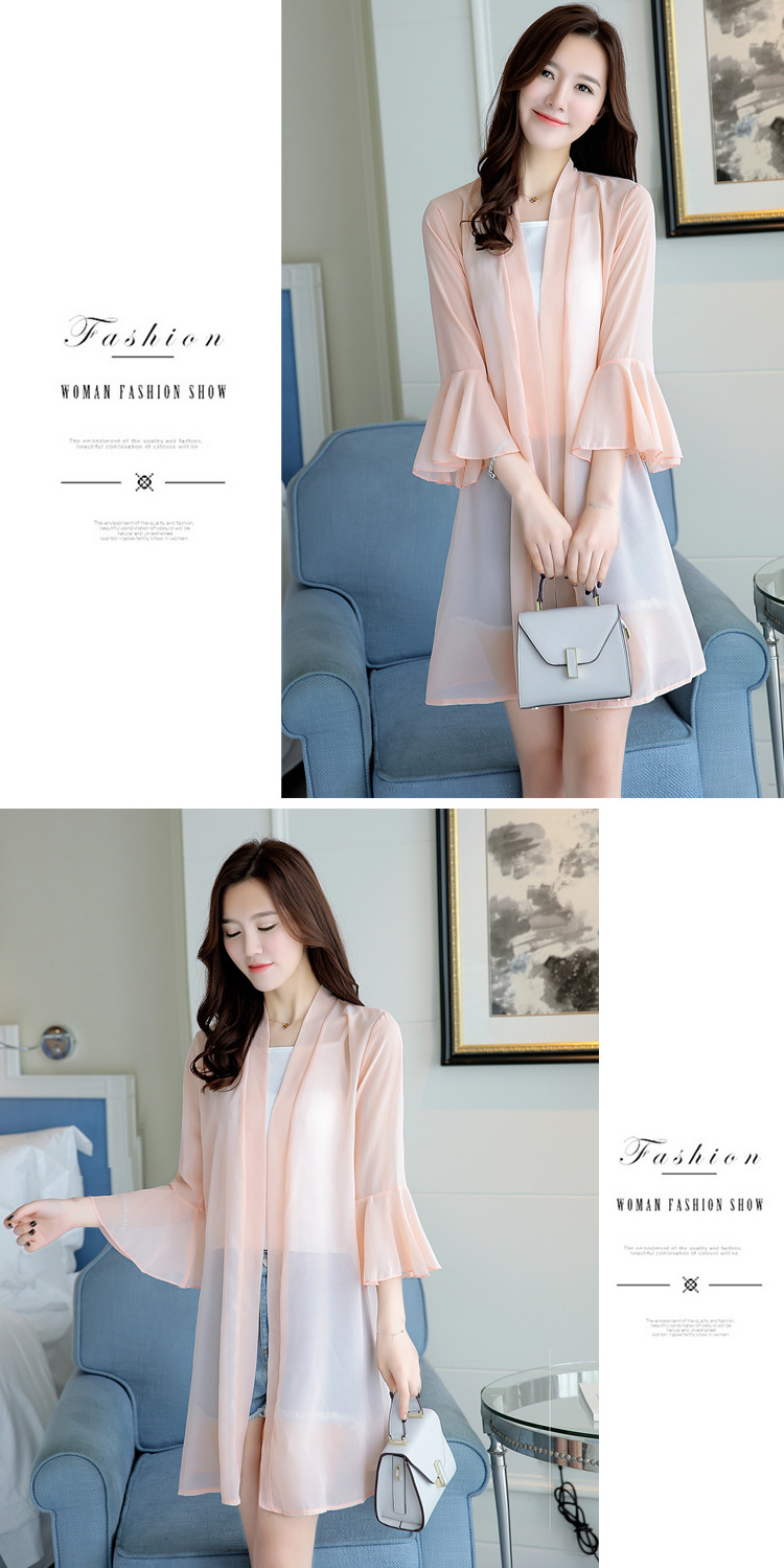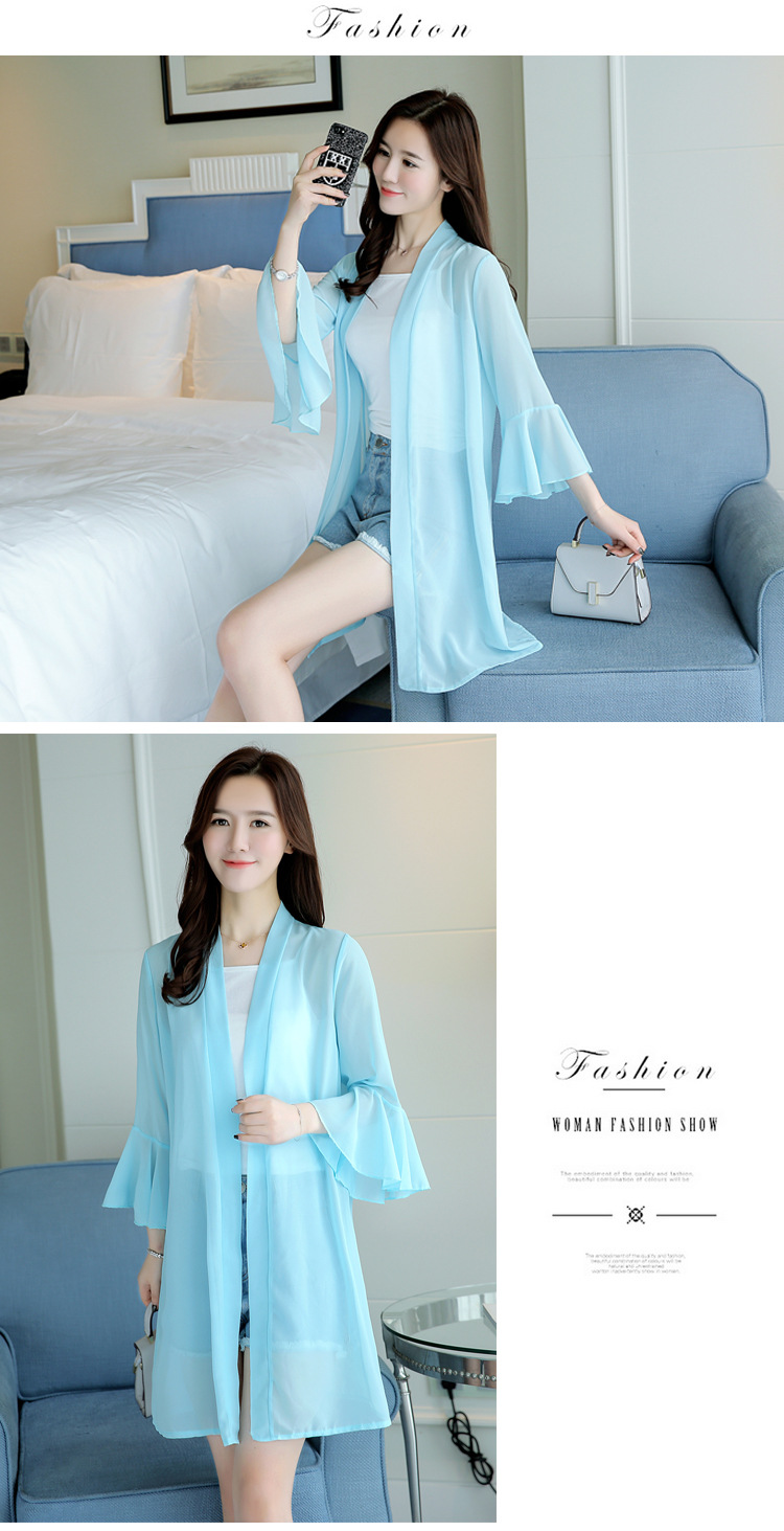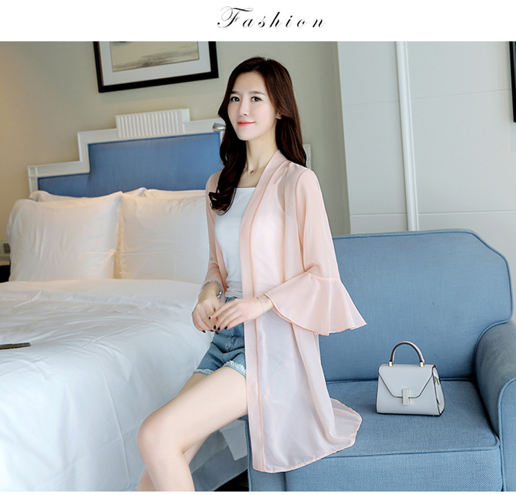 2023 새로운 여름 스타일 중간 길이 쉬폰 카디건 얇은 코트 숄 탑 슈퍼 요정 겉옷 여성용 솔리드 컬러 자외선 차단 의류스토어 가기