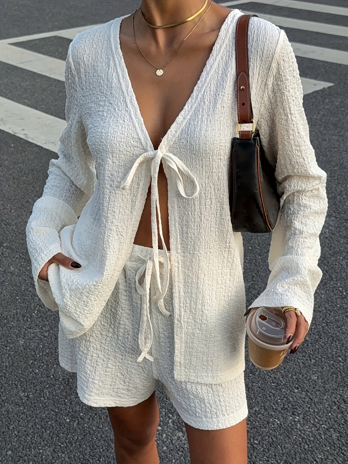 2025 새로운 유럽과 미국의 국경 아마존 대외 무역 여성 투피스 레이스 업 카디건 긴 소매 반바지 캐주얼 세트