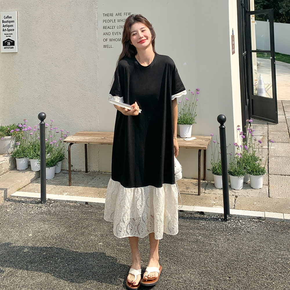 실제 샷 콘트라스트 컬러 레이스 스티칭 짧은 소매 2025 원피스 새로운 연령 감소 학술 스타일 간단한 기질 크루 넥 원피스스토어 가기