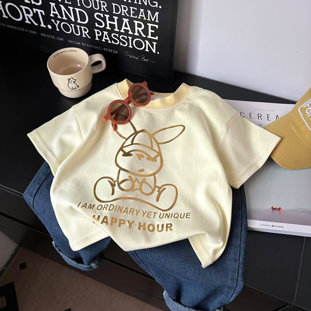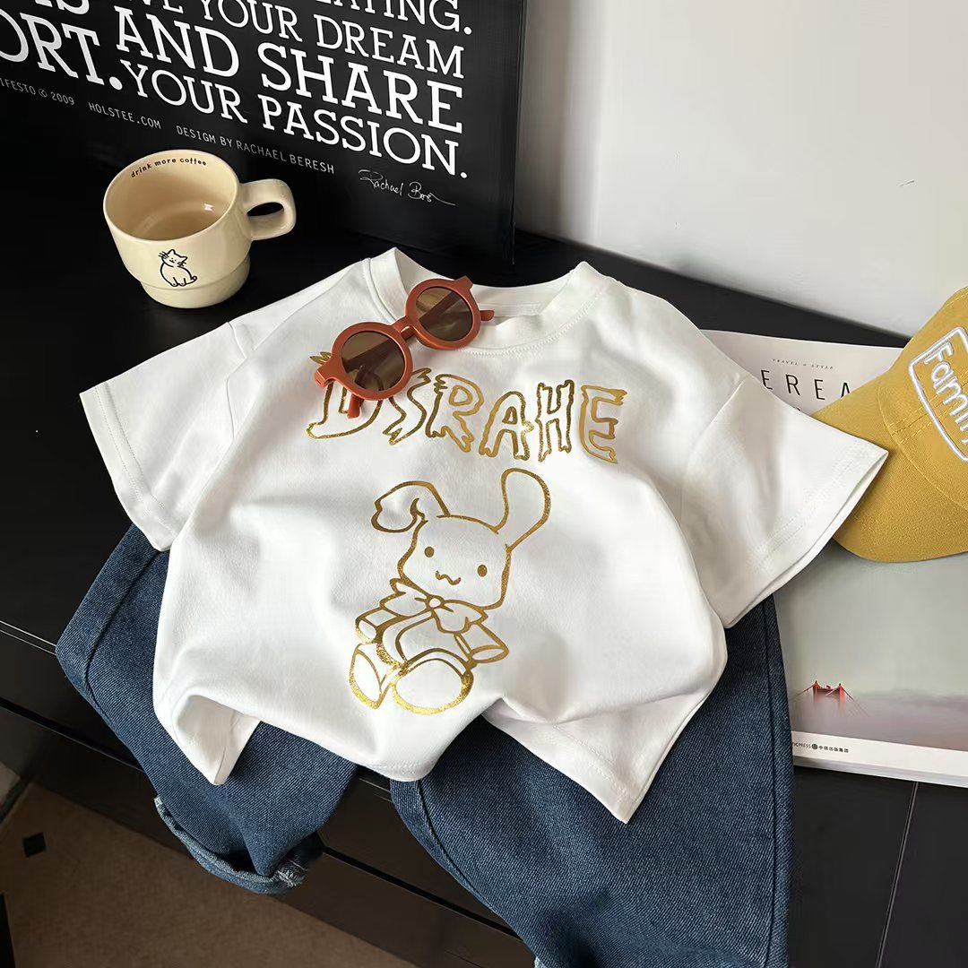 여름 새 어린이 면 반팔 티셔츠 여름 아기 만화 한국 톱 핫 골드 패션 옷