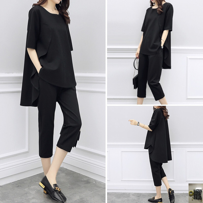 아마존 봄과 여름 한국 여성 느슨한 슬리밍 패션 세트 반팔 최고 캐주얼 카프리 바지 투피스 세트스토어 가기