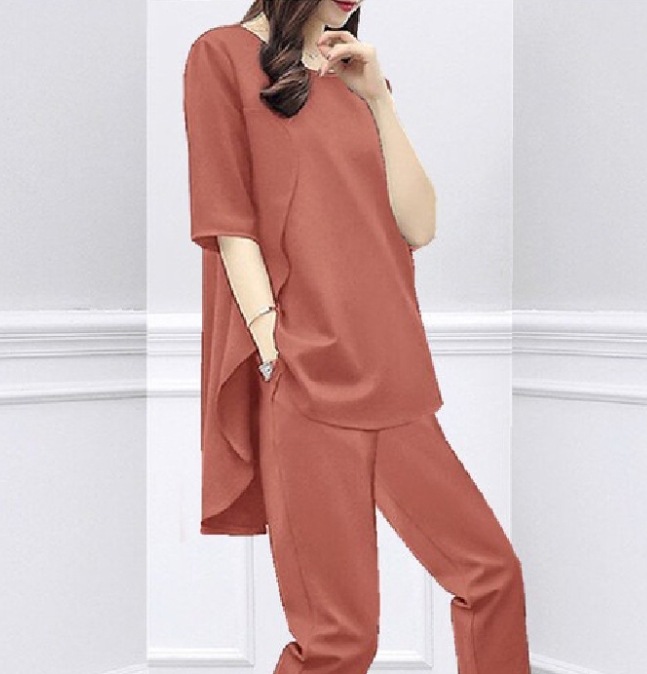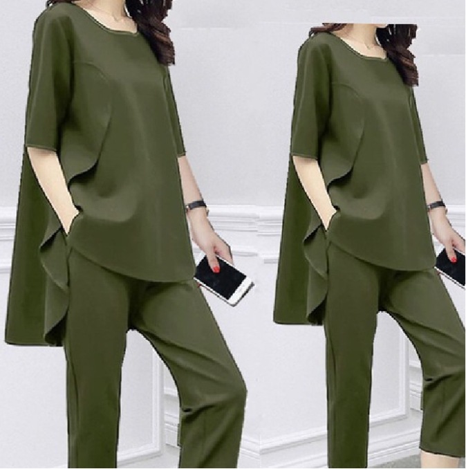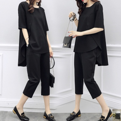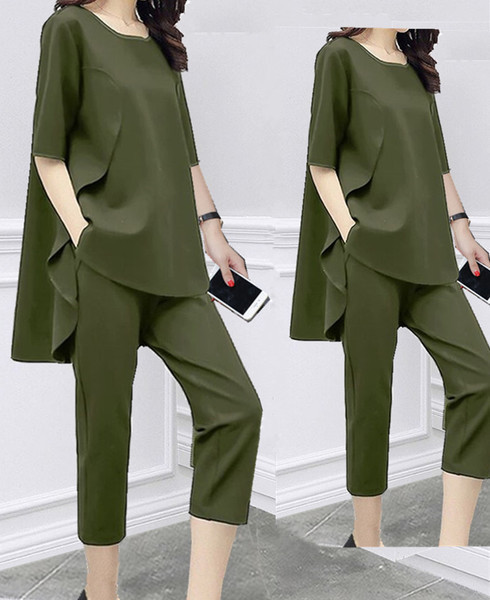 아마존 봄과 여름 한국 여성 느슨한 슬리밍 패션 세트 반팔 최고 캐주얼 카프리 바지 투피스 세트