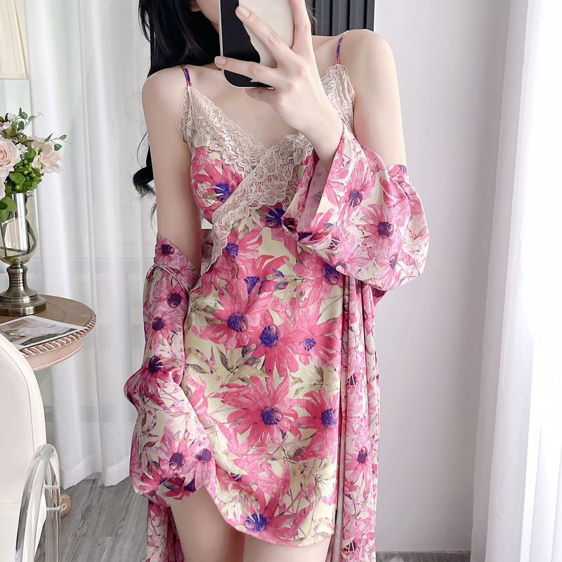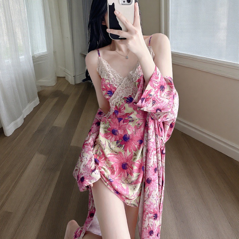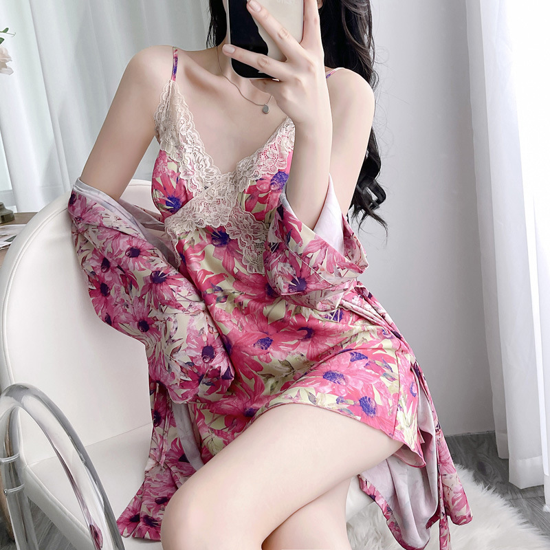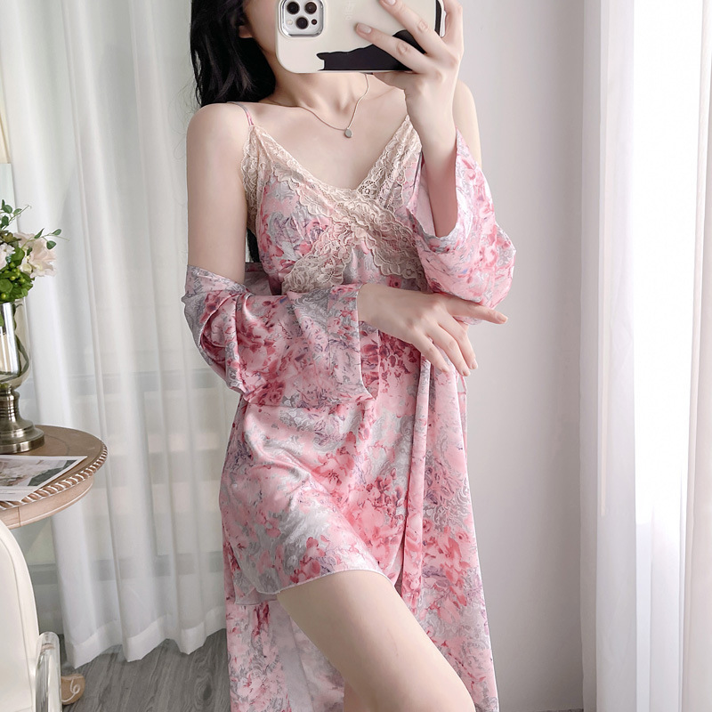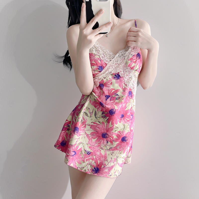 • 새틴 아이스 실크 잠옷 - 핑크 꽃