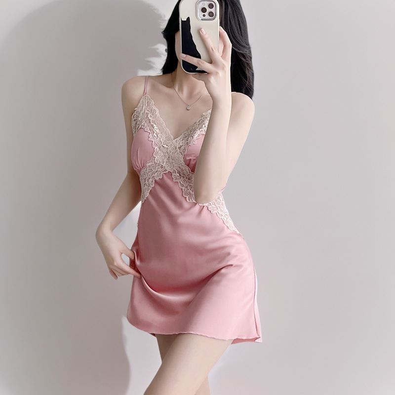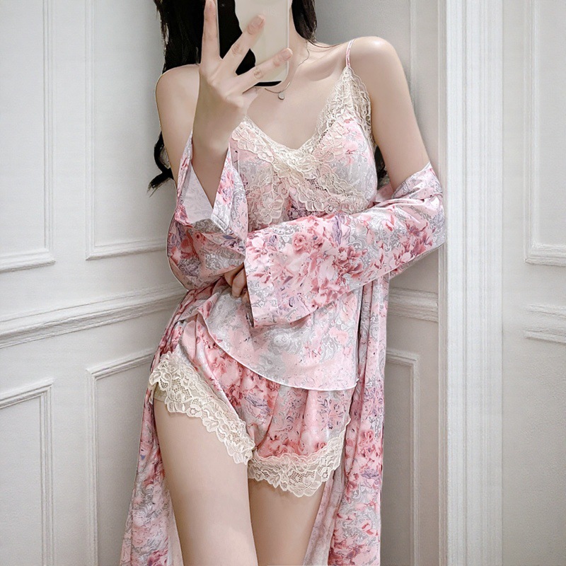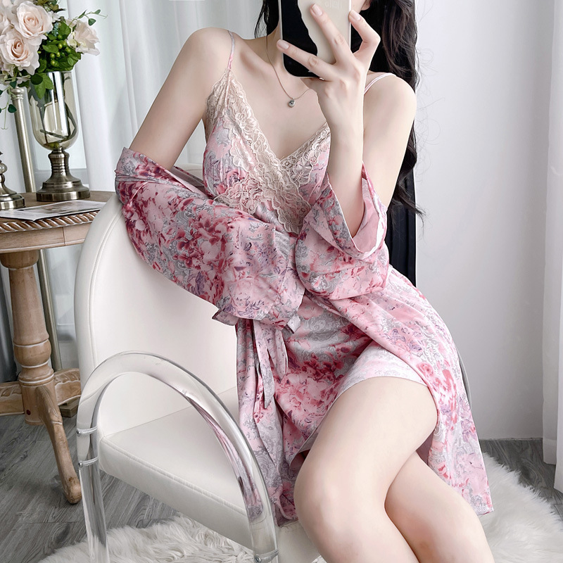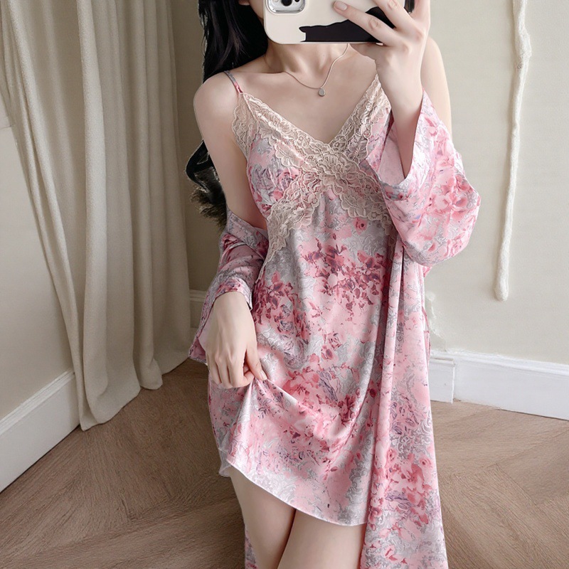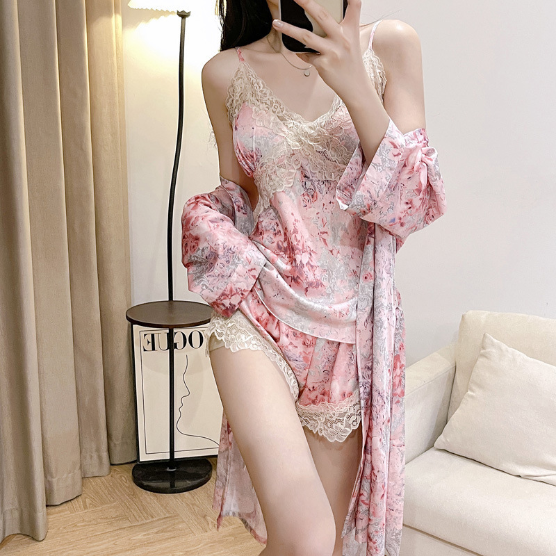 • 새틴 아이스 실크 잠옷 - 핑크 꽃