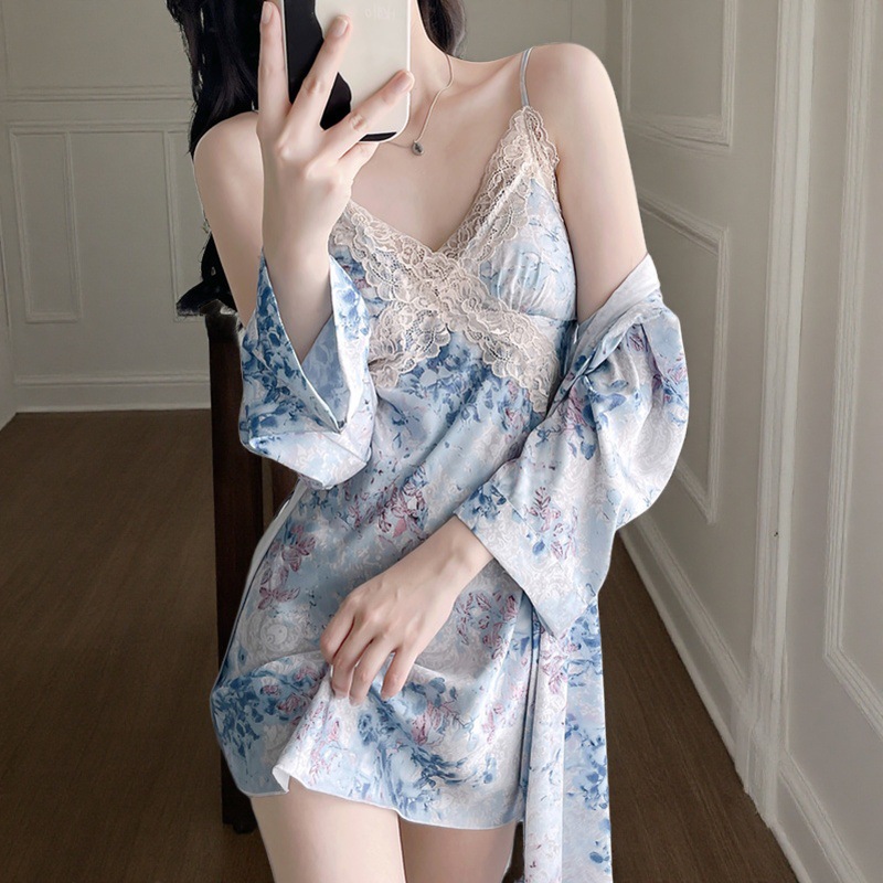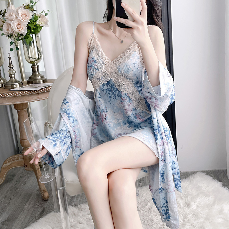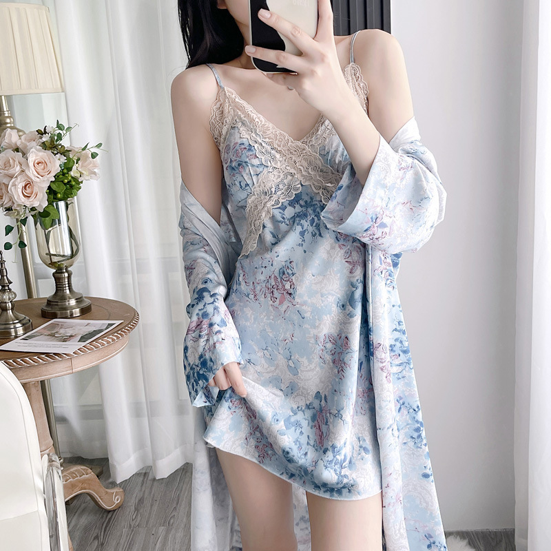 • 새틴 아이스 실크 잠옷 - 파란색과 흰색