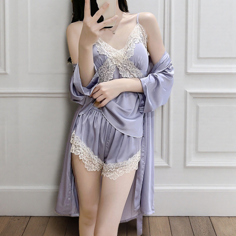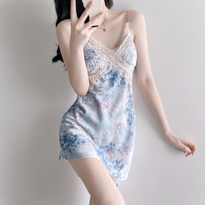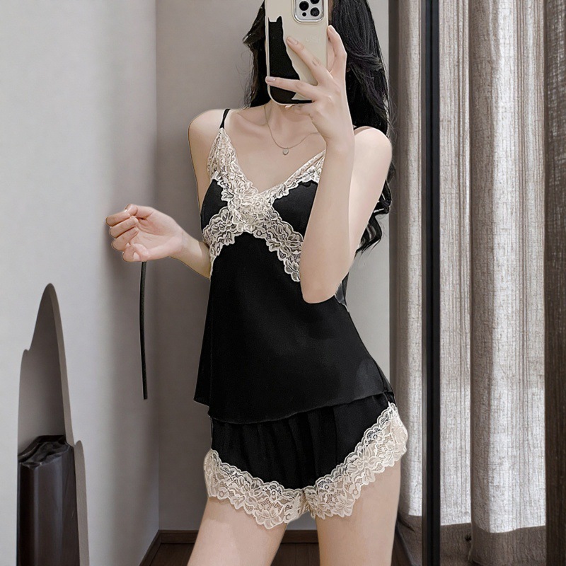 온라인 축하 라이브 숙녀 여름 얇은 섹시한 잠옷 아이스 실크 봄과 가을 슬링 반바지 머리카락을위한 잠옷 투피스 세트