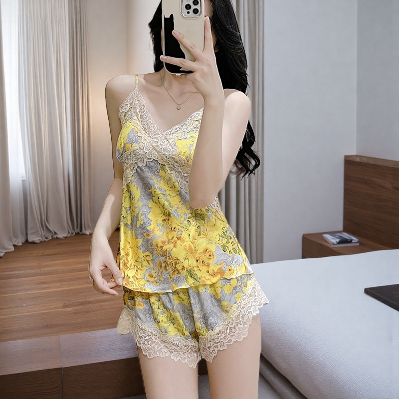 온라인 축하 라이브 숙녀 여름 얇은 섹시한 잠옷 아이스 실크 봄과 가을 슬링 반바지 머리카락을위한 잠옷 투피스 세트스토어 가기