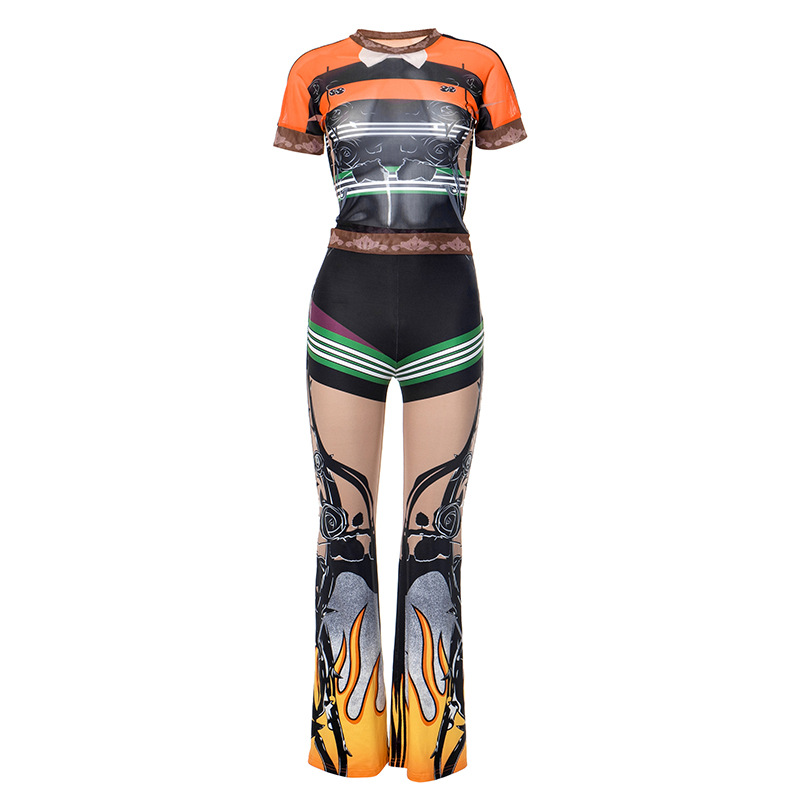 K25ST046 유럽과 미국의 국경 간 여성 봄 여름 페인트 시스루 메쉬 라운드 넥 풀오버 탄성 하이 웨이스트 트럼펫 슈트스토어 가기