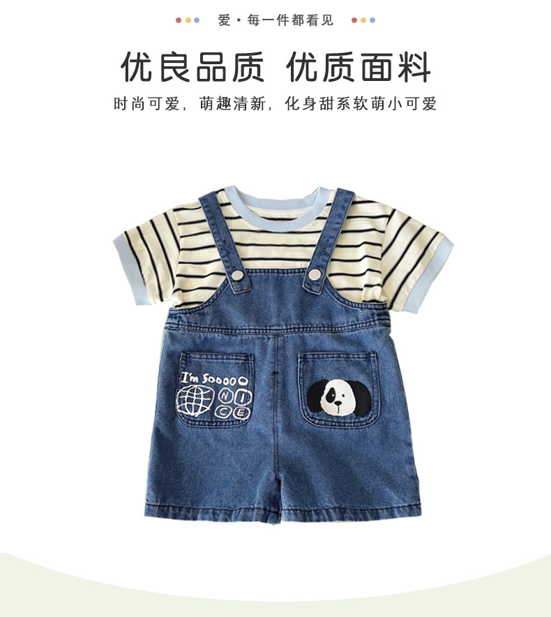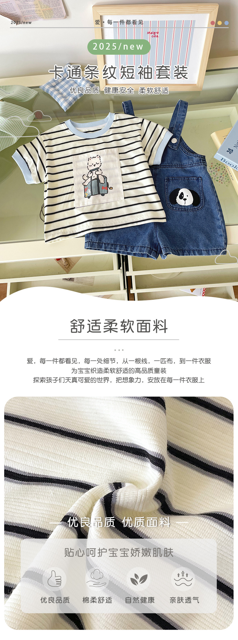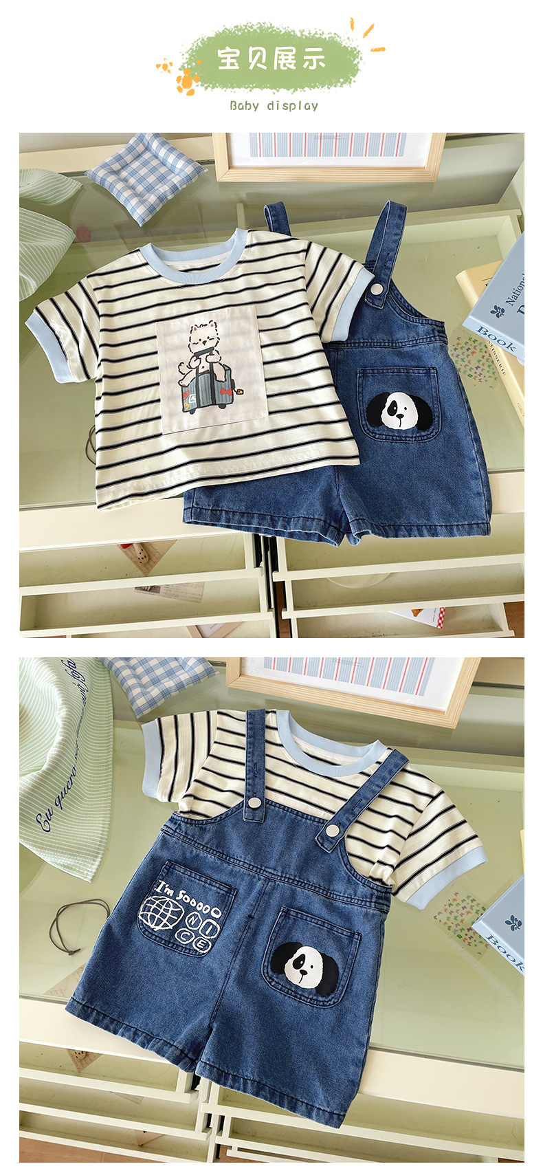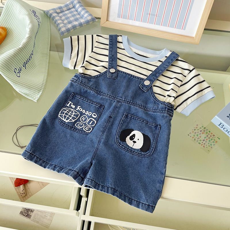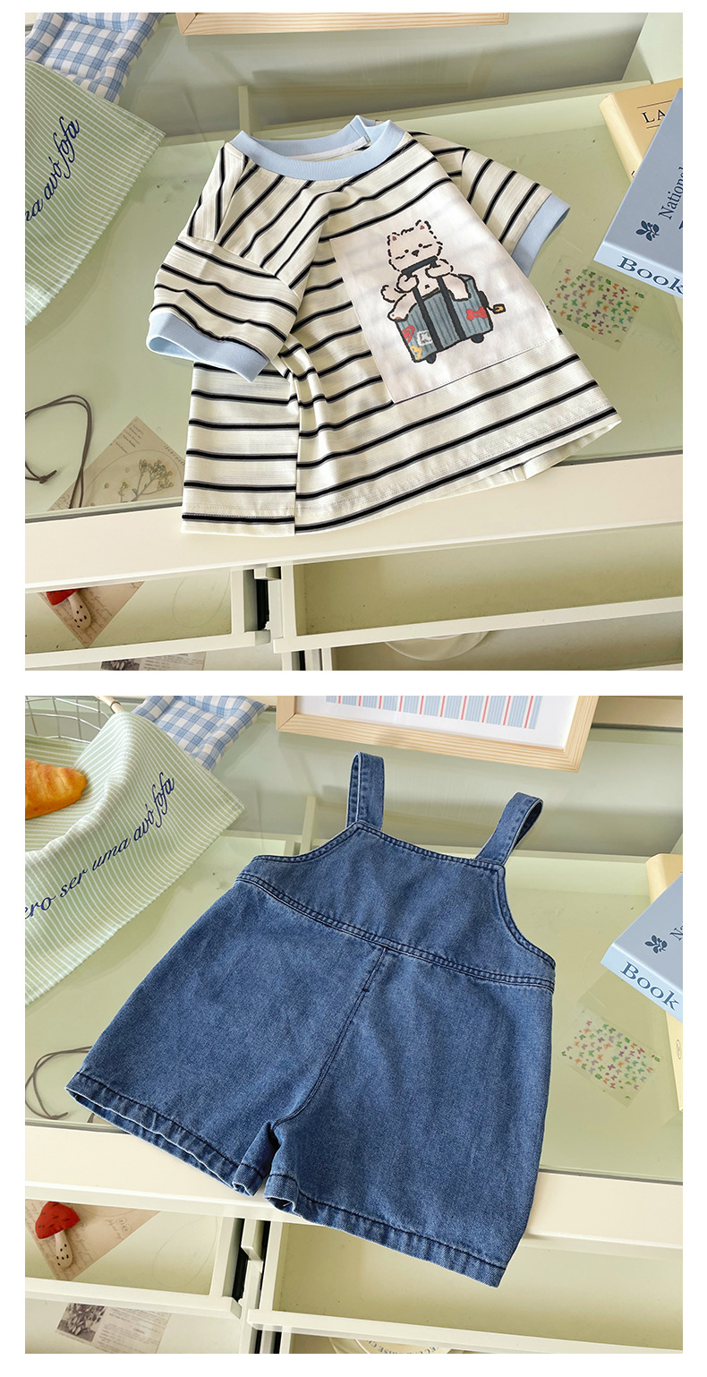 [재고 있음] XY253031 티셔츠 + XK253008 데님 오버올 남아 스트라이프 반팔 오버올 슈트