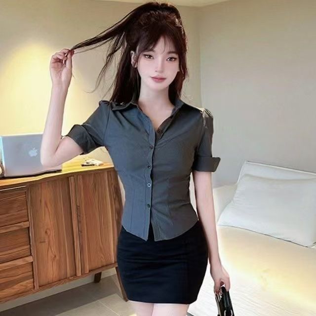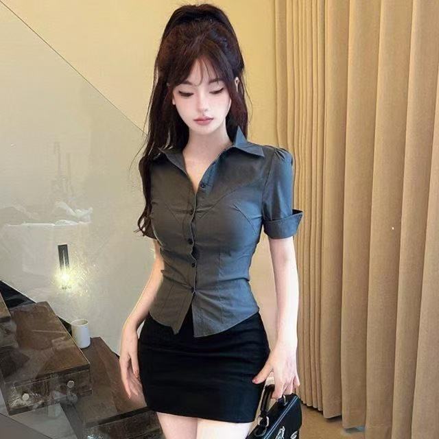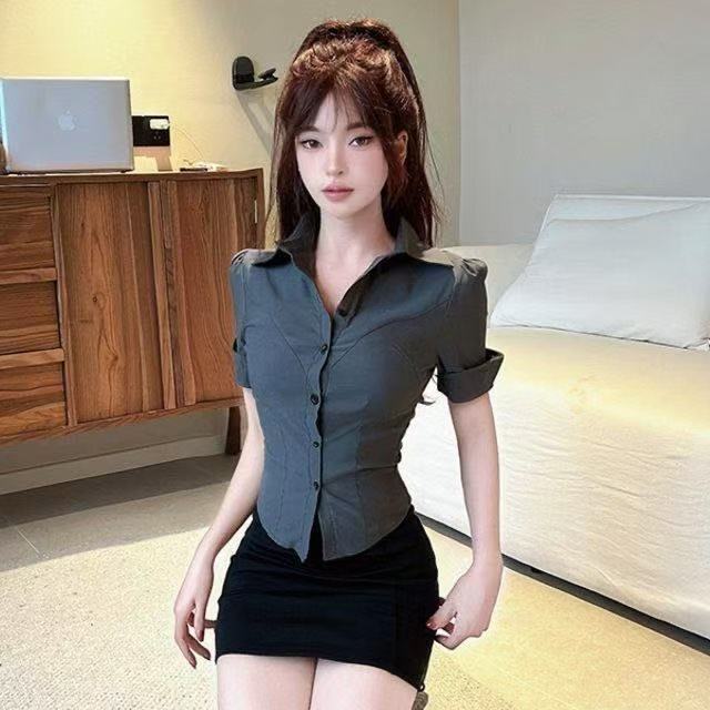 단단한 허리 셔츠 새로운 스파이스 소녀 유니폼 슬림 핏 순수한 욕망 스타일 여름 반팔 세트 디자인 셔츠 주름 치마 세트