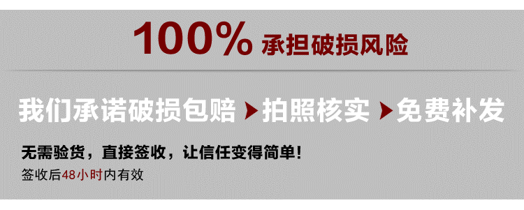 答:【陶发陶瓷】承诺零风险购物。如果收到的宝贝出现破损,请您不要慌乱,放心的签收,然后将破损产品的照片在48小时内传给我们的在线工作人员,我们会立刻给您免费补发一份(免邮费,免产品费)。我们一定会保证客户的利益,让您得到完整的宝贝,我们现有专业包装团队,数十年运输经验,破损率一直持续在千分之一以下。