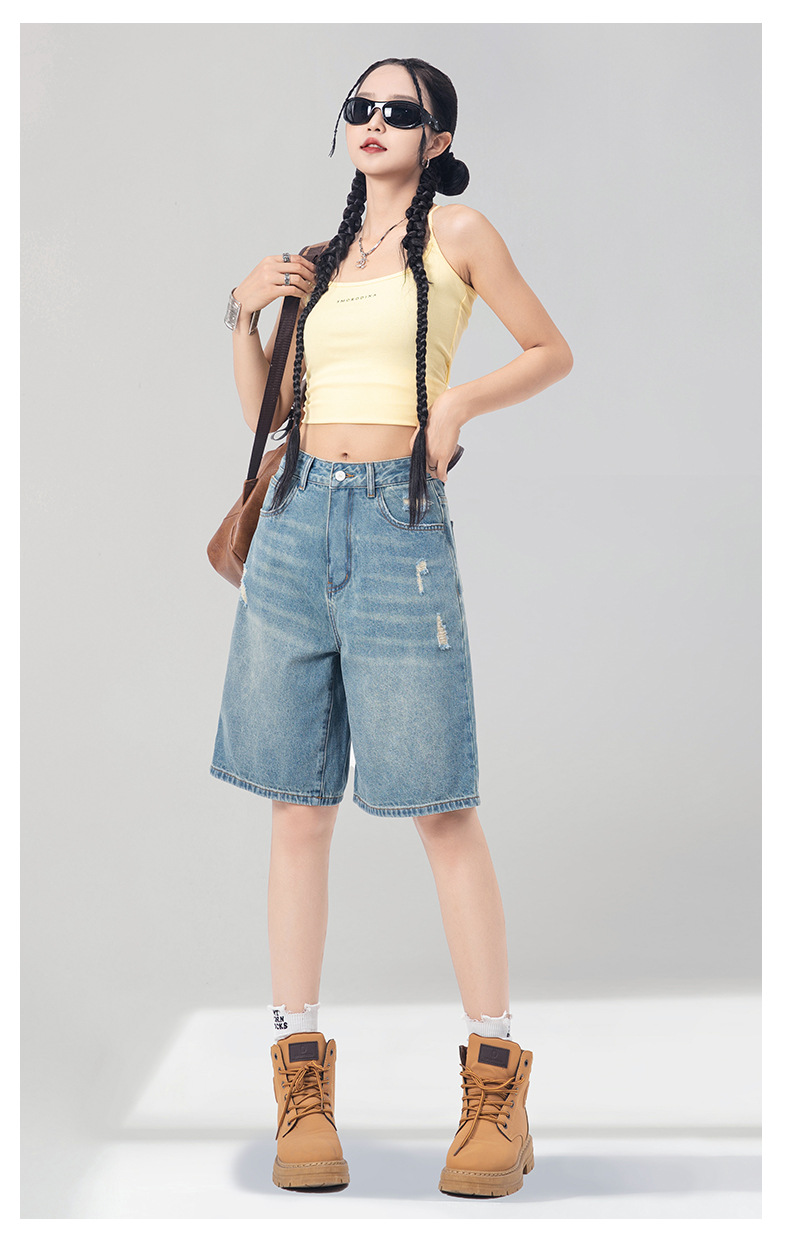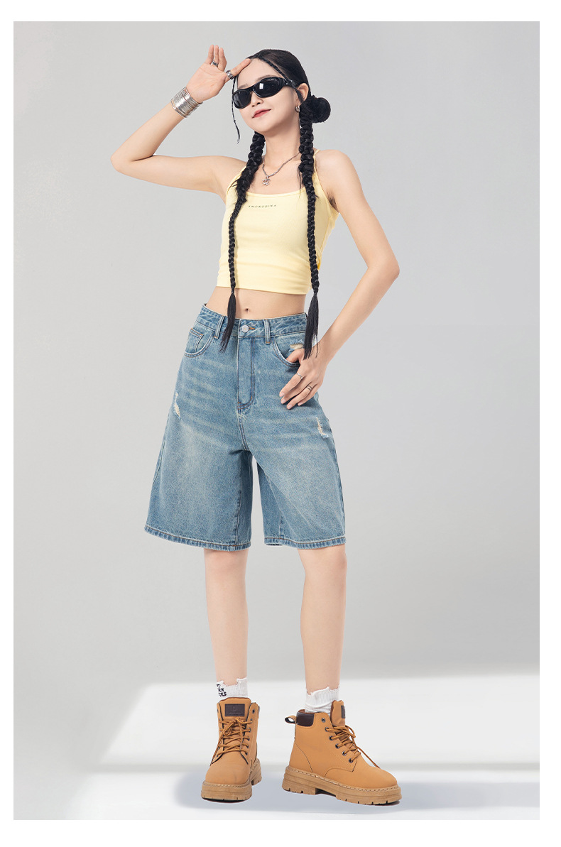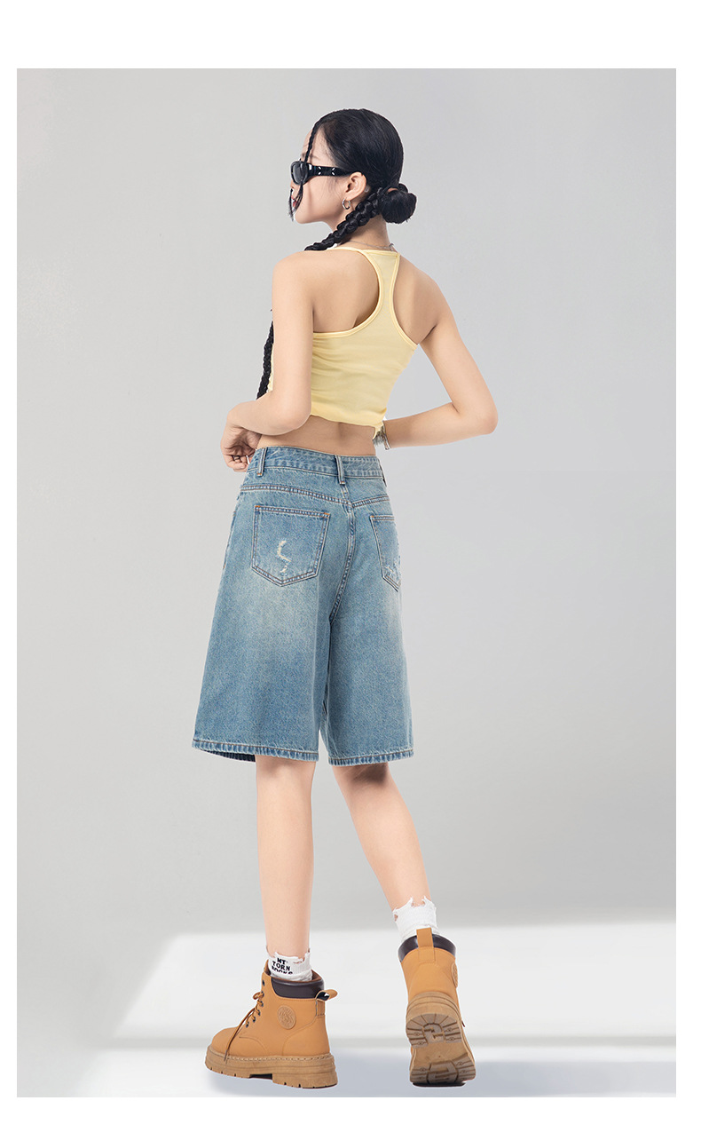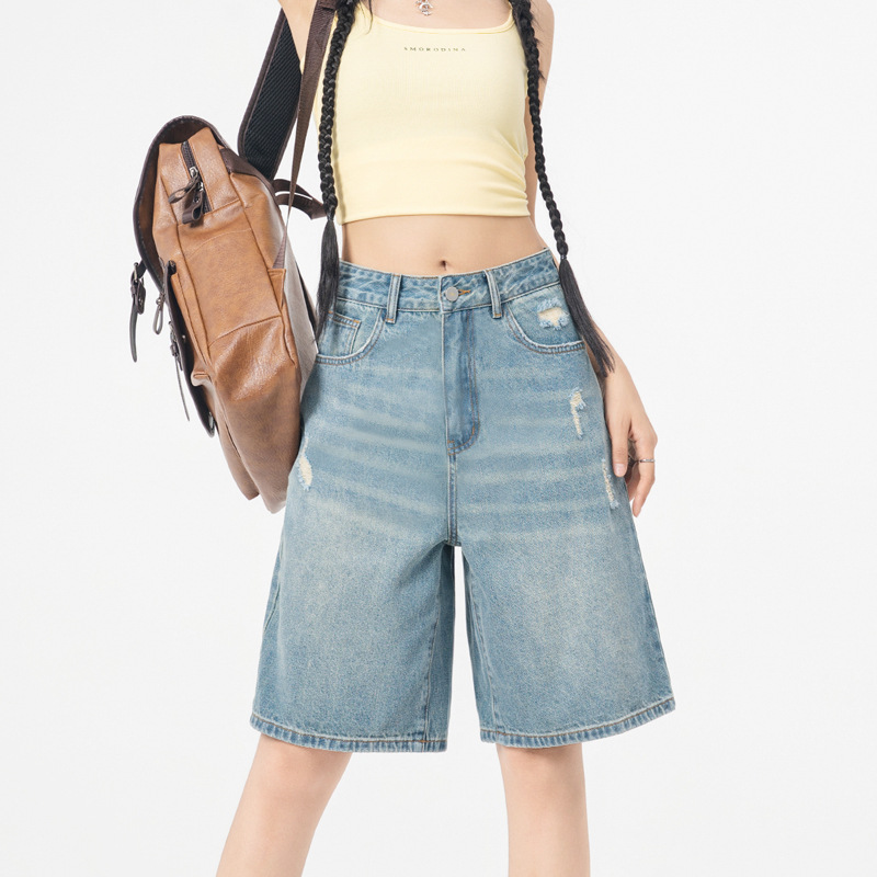 레트로 블루 스트레이트 레그 5부 데님 반바지 여성용 여름 2026 신상 루즈핏 하이 스트리트 디자인 와이드 레그 다용도 활용 가능스토어 가기
