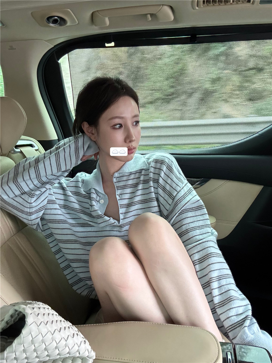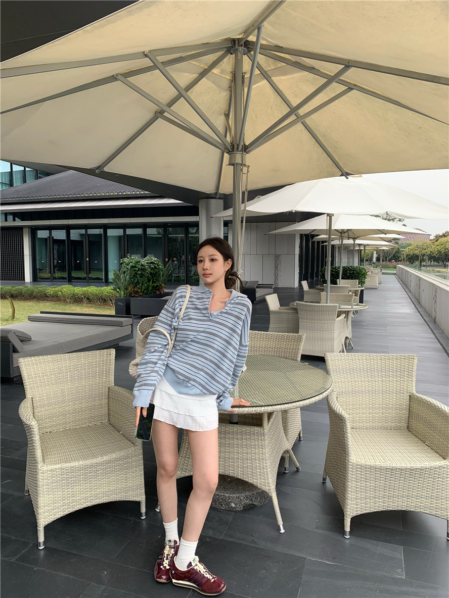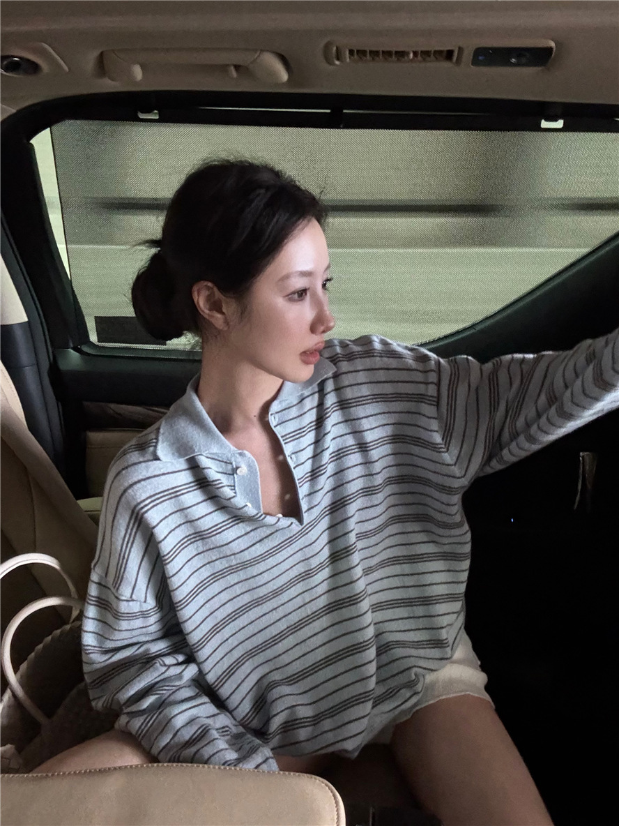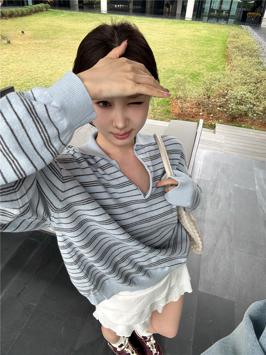 여성 가을 한국 복고풍 줄무늬 싱글 브레스트 긴팔 폴로 셔츠 탑 라펠 스웨터 화이트 스커트 세트스토어 가기