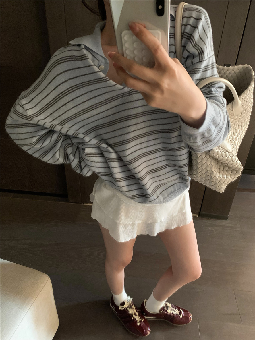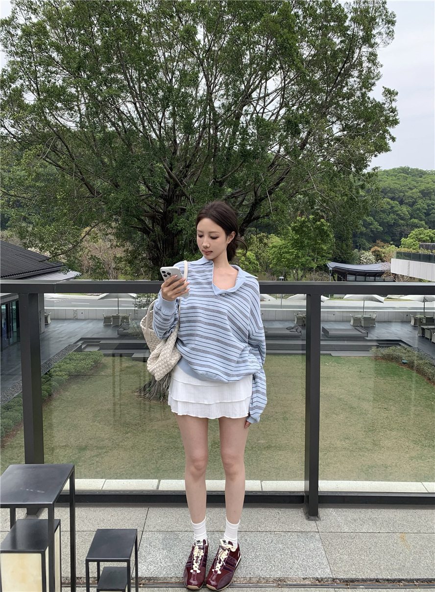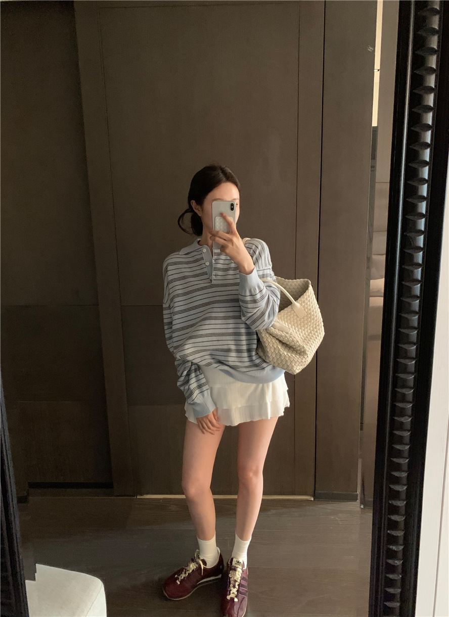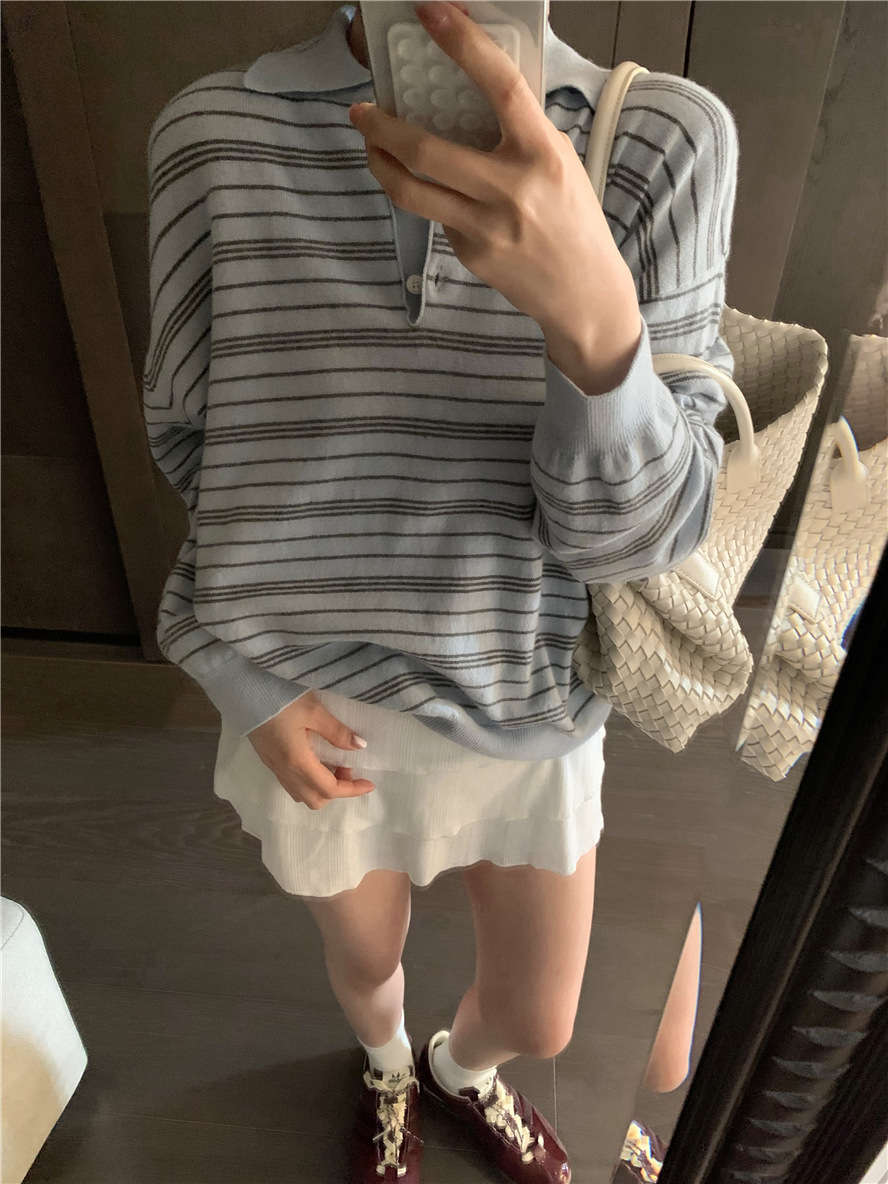 여성 가을 한국 복고풍 줄무늬 싱글 브레스트 긴팔 폴로 셔츠 탑 라펠 스웨터 화이트 스커트 세트