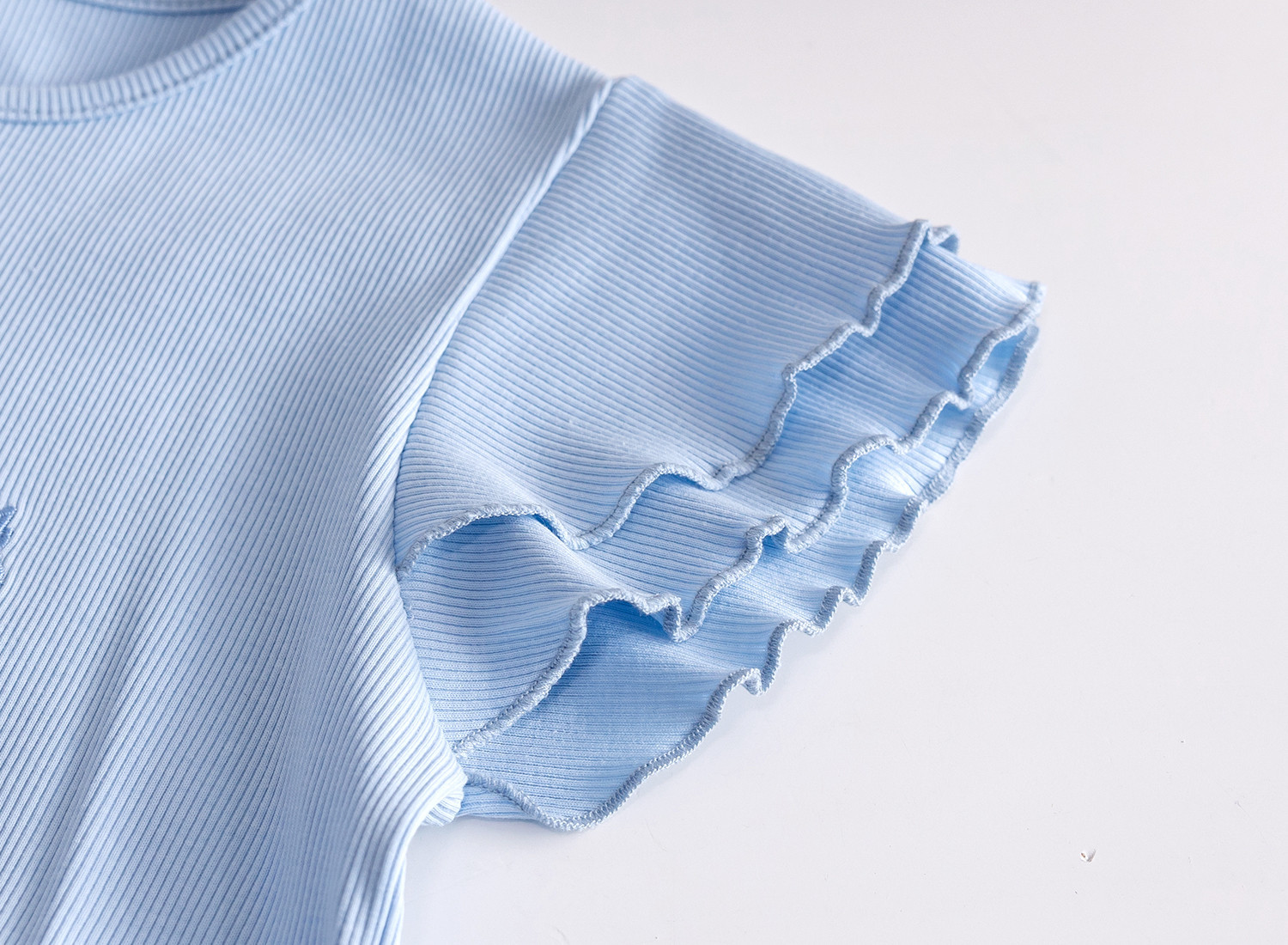 2025 소녀 세트 블루 귀 테두리 최고 반팔 티셔츠 웨이브 포인트 버드 반바지 여름 새 투피스 세트