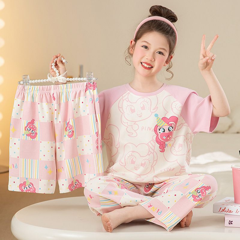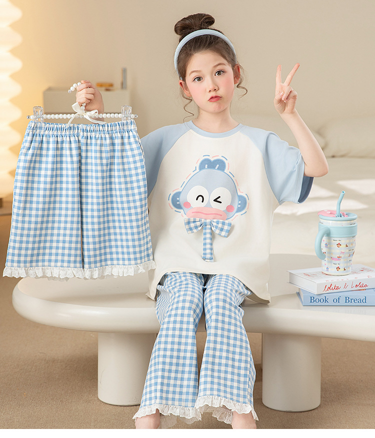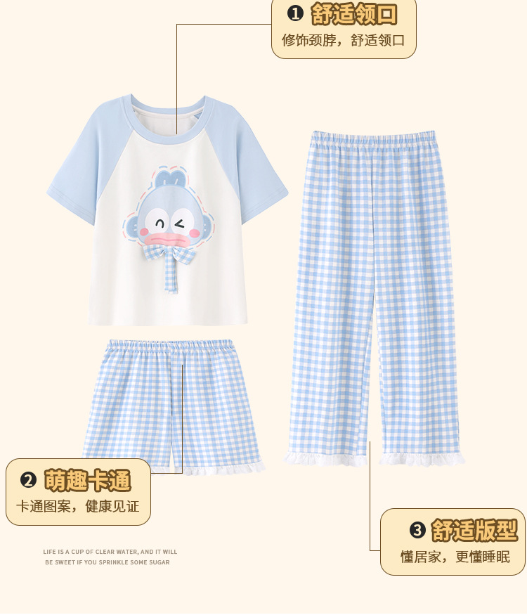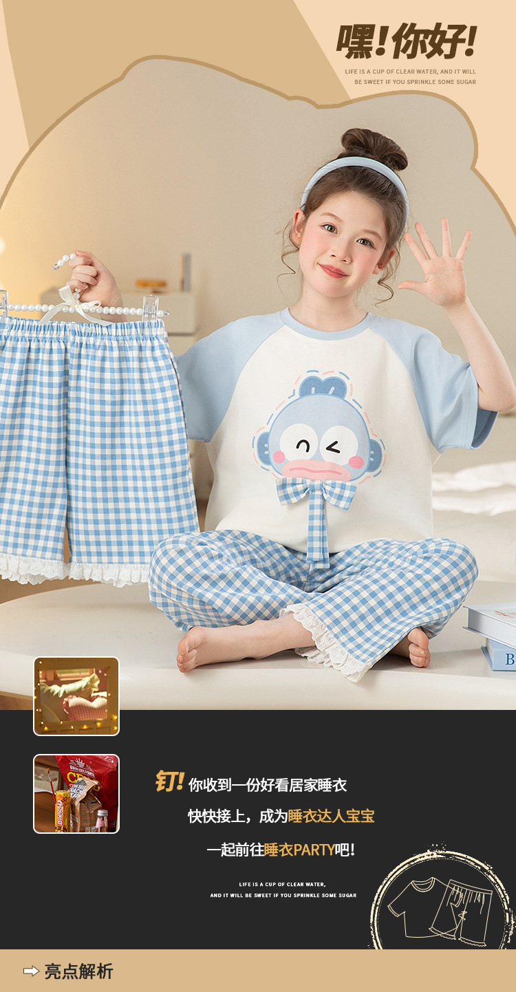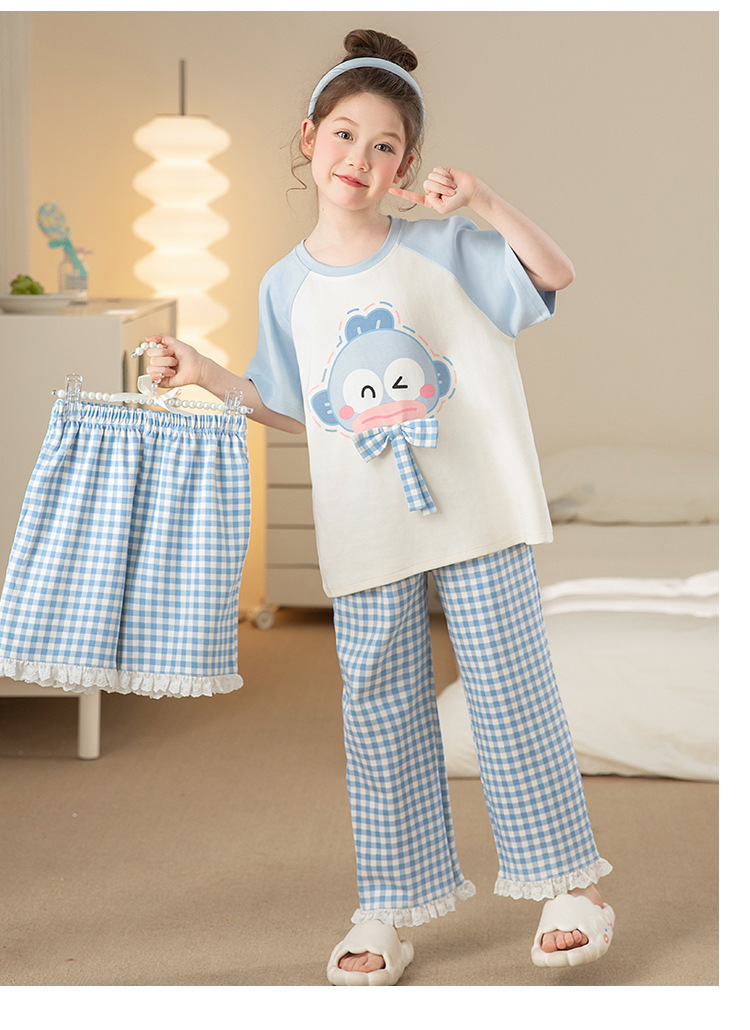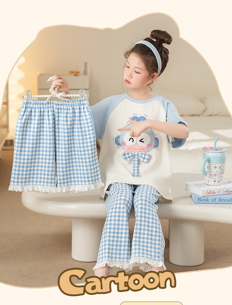 만화 중대형 어린이 봄과 여름 소녀 반팔 파자마 소녀의 집 옷 세트 외형 3 피스 코튼 반바지스토어 가기
