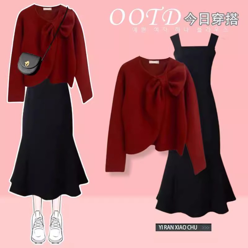 올해 인기 있는 아름다운 정장 여성 신작 봄 패션 작은 향기로운 빨간색 스웨터 드레스 대형 투피스 세트스토어 가기
